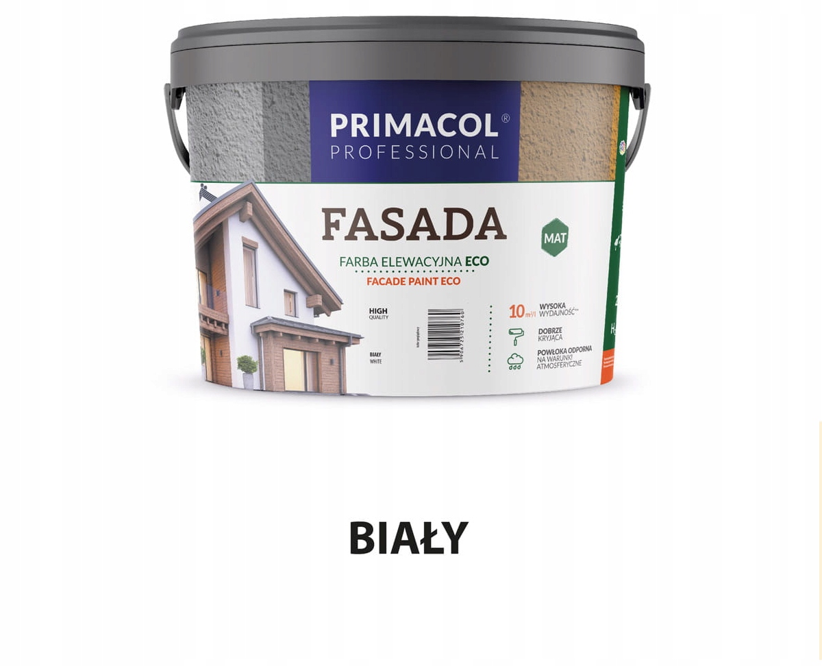 Еко -прималовий професійний фасад - акрилова фарба, з додаванням силікону, призначеного для фарбування фасадів будівель, високого покриття та стійкості до погодних умов. Він створює матовий, довговічний і дозволяє стінам "дихати". Він призначений для використання на цементі, пластівці цементу та інших мінеральних субстратів поза приміщеннями.