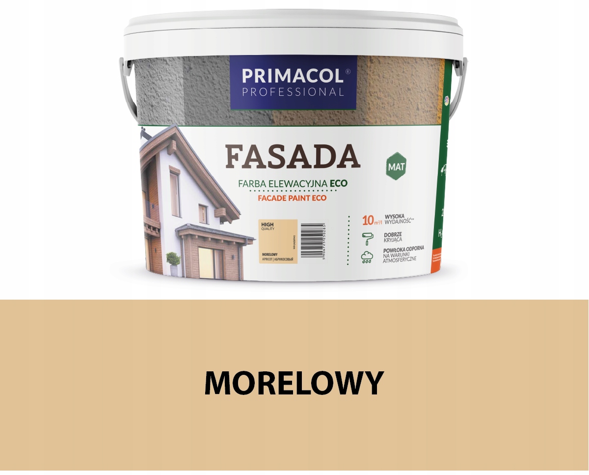 Еко -прималовий професійний фасад - акрилова фарба, з додаванням силікону, призначеного для фарбування фасадів будівель, високого покриття та стійкості до погодних умов. Він створює матовий, довговічний і дозволяє стінам "дихати". Він призначений для використання на цементі, пластівці цементу та інших мінеральних субстратів поза приміщеннями.
