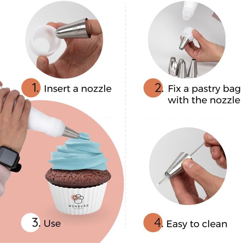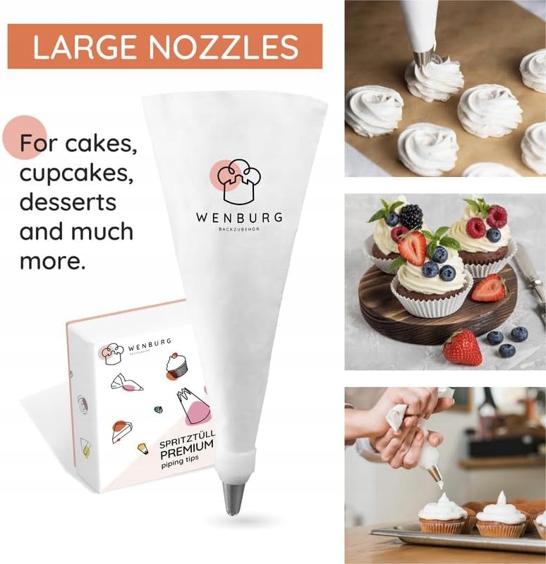 - Великі наконечники для декорування, які дозволяють створювати гарні прикраси всіх видів – кекси, як із пекарні! Особливо підходить для тортів, кексів і тістечок. Також для пісочного печива