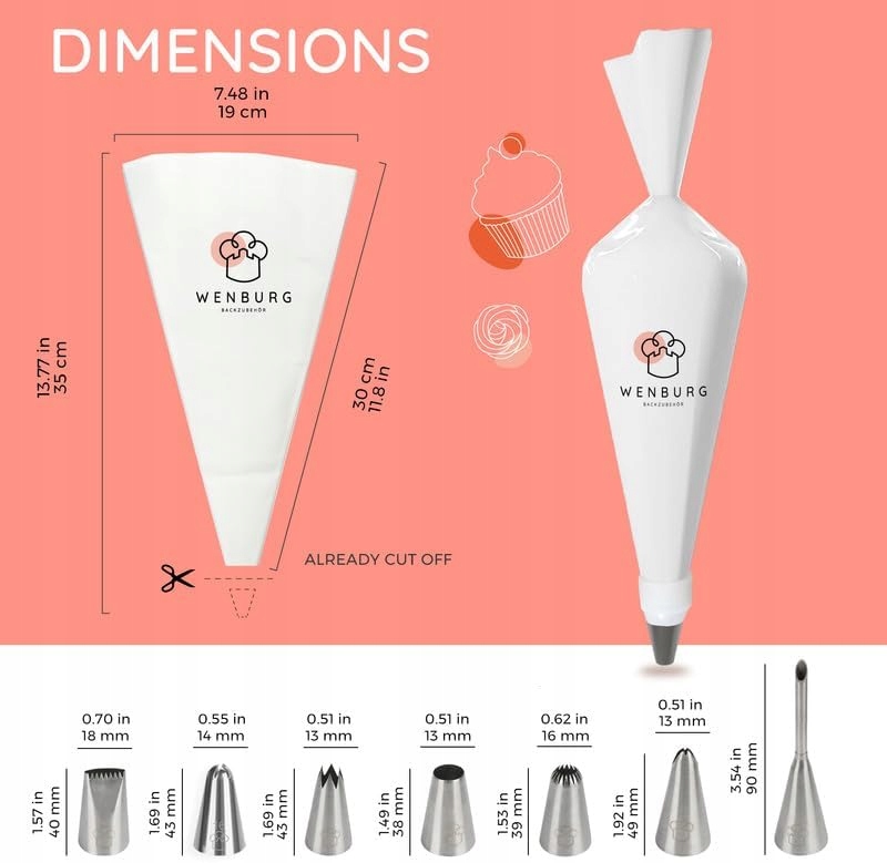 - Ідеальний стартовий набір для випікання професійної якості: 7 наконечників для декорування (насадка входить до комплекту), 1 великий бавовняний кондитерський пакет (35 см) з додатковим внутрішнім покриттям, 1 перехідник. Створюйте троянди, зірки