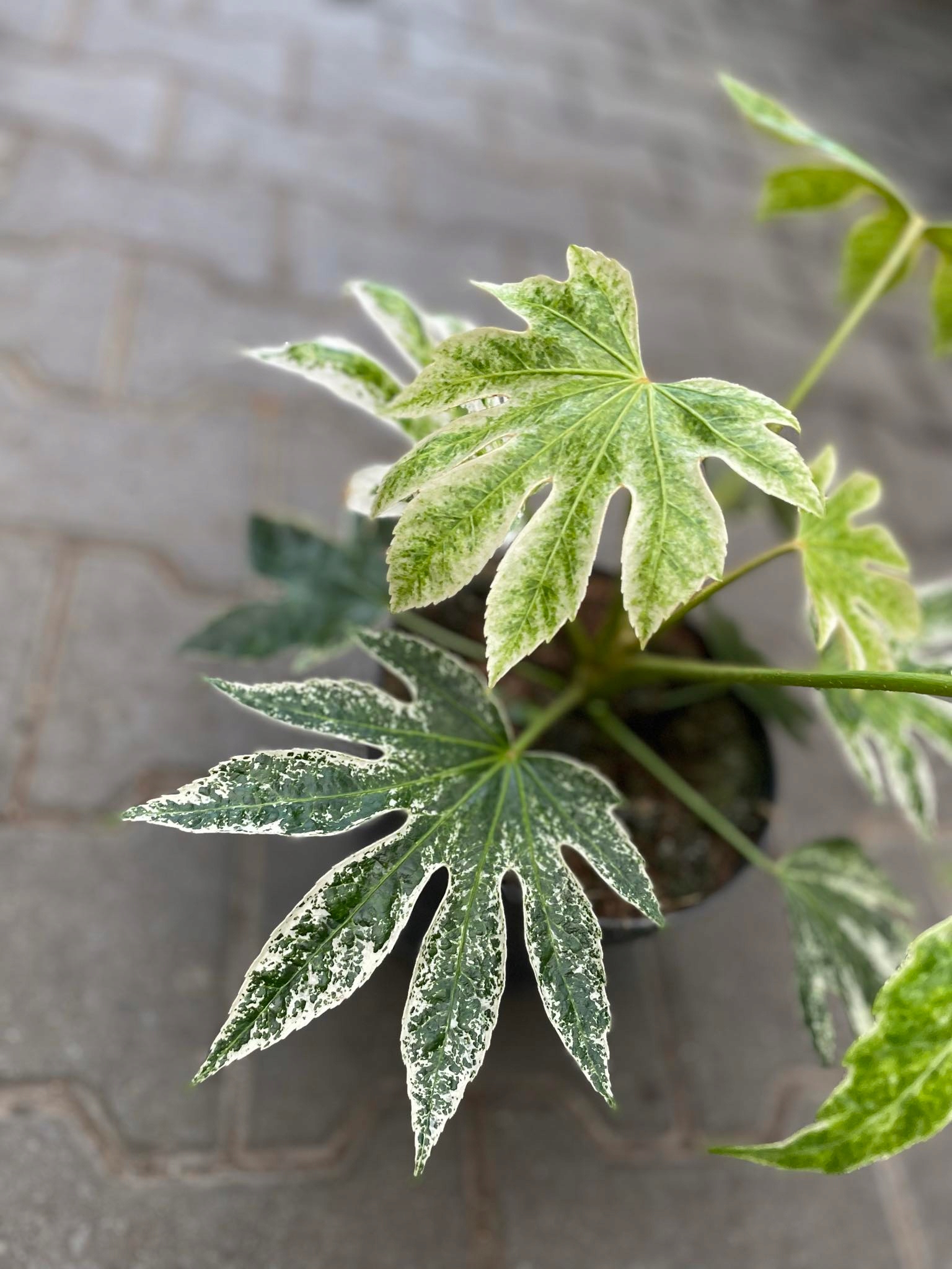 Fatsia japonica variegata — це кімнатна рослина, яку часто вирощують як прикрасу будинків і садів завдяки її привабливим листям. Він стійкий і простий у вирощуванні, добре росте в місцях з яскравим, але розсіяним світлом і помірно вологим ґрунтом.
