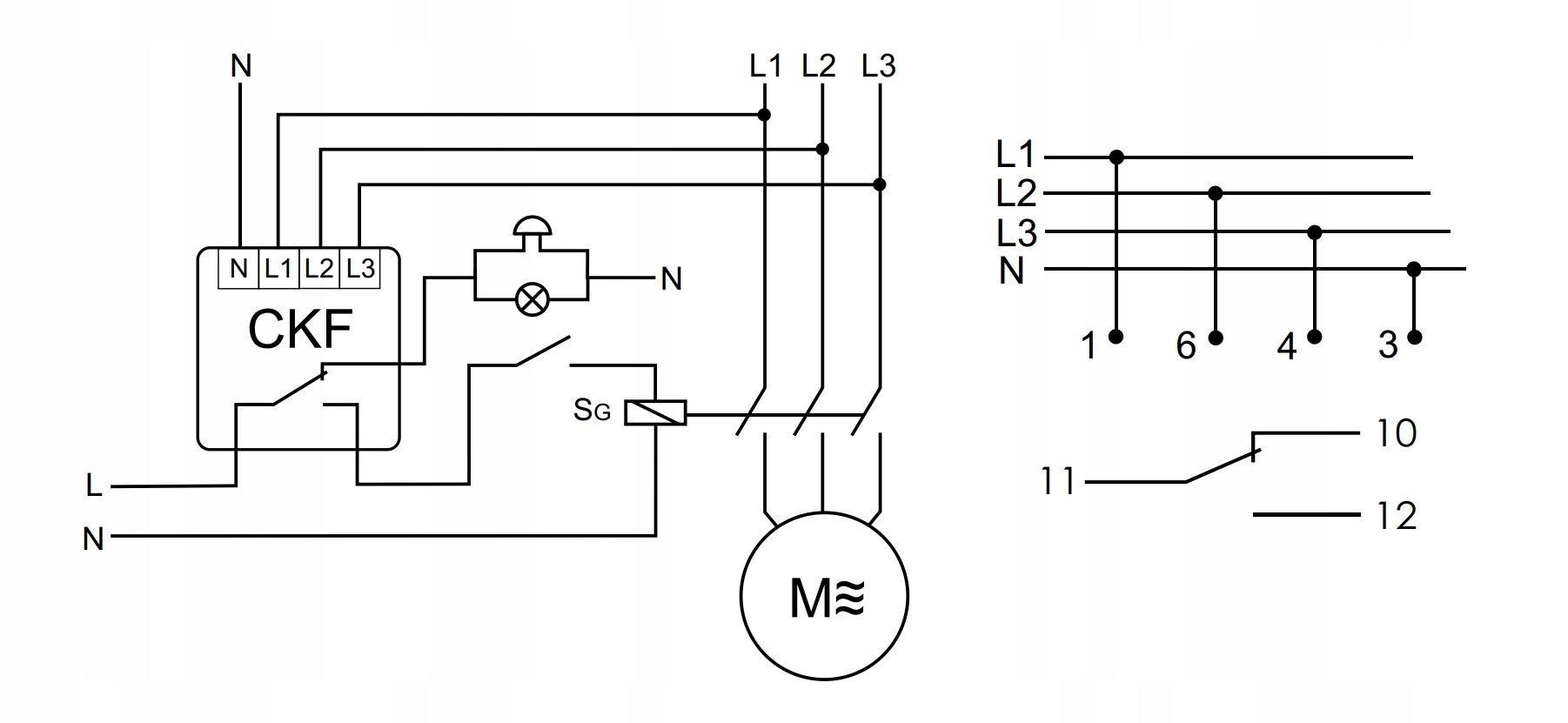 Втрата напруги принаймні в одній, будь-якій фазі або асиметрія напруги між фазами вище порогу активації призведе до вимкнення двигуна. Відключення відбудеться із затримкою в 4 секунди, що запобігає випадковому відключенню двигуна в разі короткочасного перепаду напруги. Він автоматично ввімкнеться знову, коли напруга підвищиться на 5 В вище напруги активації (тобто на значення гістерезису напруги). При перерахованих вище аномаліях запуск двигуна неможливий. Якщо послідовність фаз перед датчиком змінюється, викликаючи небажану зміну напрямку обертання двигуна, датчик не дозволить двигуну запуститися. Повторне підключення можливе після відновлення правильної послідовності фаз.