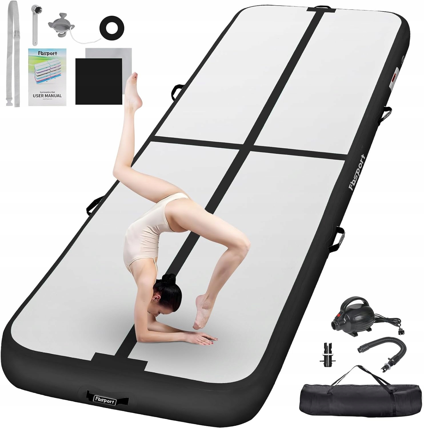 FBSPORT AirTrack Mat 200 × 100 × 10 см, насос, будинок і вода, чорний та сірий