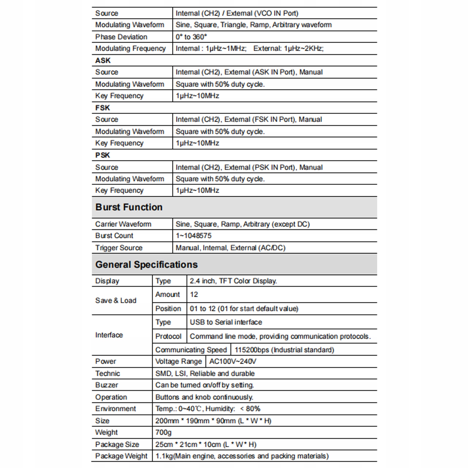 - Хвиля: синус, квадрат, прямокутник (регульований робочий цикл), імпульс (можна точно встановити ширину імпульсу та час циклу), трикутник/рампа, пилкоподібна хвиля, CMO, чотири канали TTL, DC, полиця, повна хвиля, додатний крок, зворотний крок, додатний показник, експонента, обернений показник, lornez, multiTiton, шум, трапецієподібний імпульс, інверсний, колір ліворуч, вузький, зворотний, колір ліворуч, паличка, пульсова паличка. Білий шум Гауса, AM, FM та інші 64 набори сигналів, визначених користувачем.