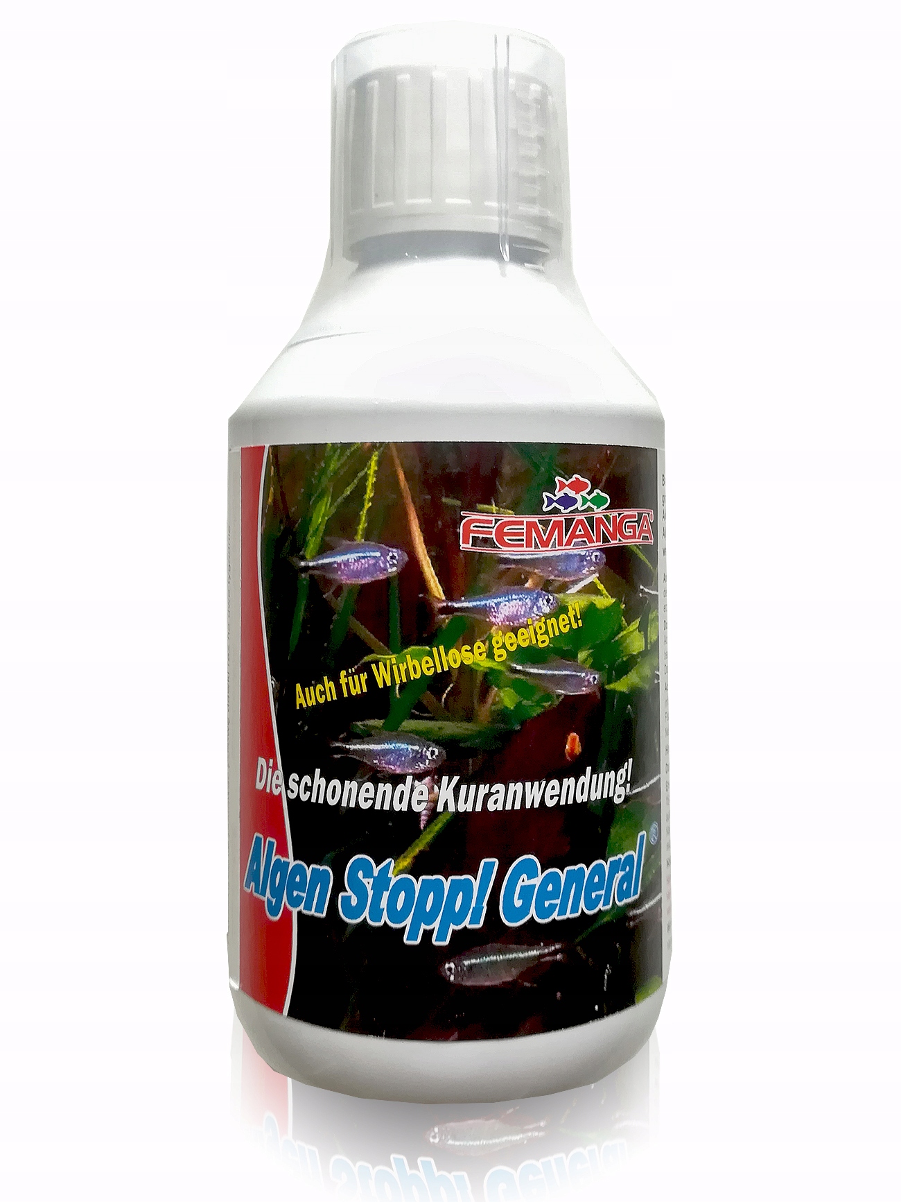 Надзвичайно ефективно знищує всі види водоростей. Раніше розпочате лікування приносить кращі та швидші результати. Введення Femanga Algen Stop General після обробки позитивно впливає на риб і рослини. В якості профілактики слід вводити половину дози, рекомендованої виробником, один раз на два тижні, навіть при покупці нових риб і рослин.