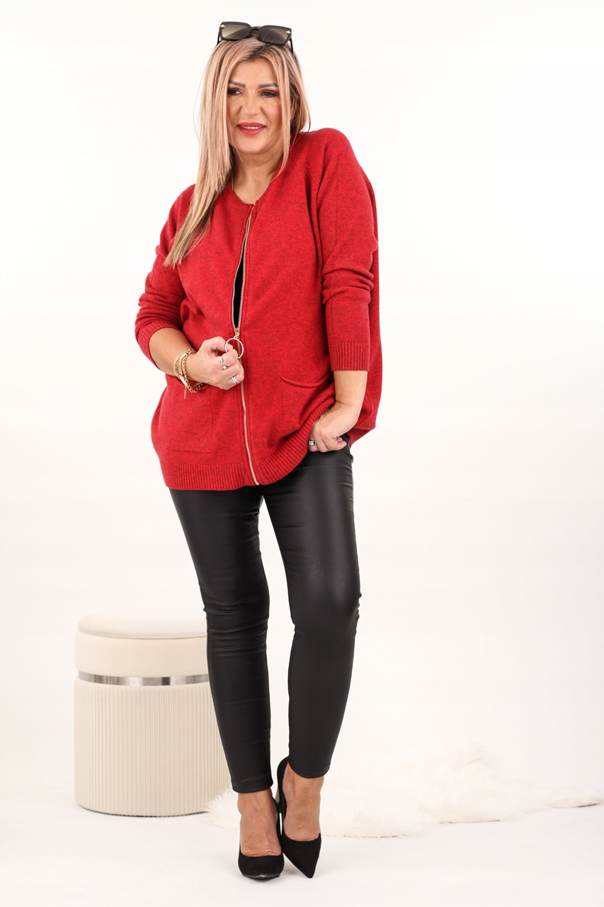 FEMIMODA sweter damski czerwony oversize do bioder luźny sweterek rozsuwany elastyczny