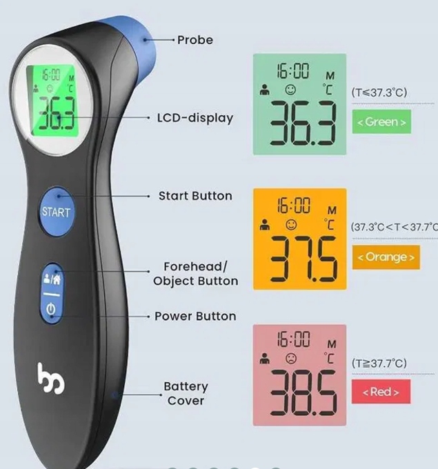 Зелений означає нормальну температуру тіла, оранжевий означає легку лихоманку, а червоний означає високу температуру. Також відображається смайлик для нормальної температури, щоб легко розпізнавати вимірювання.