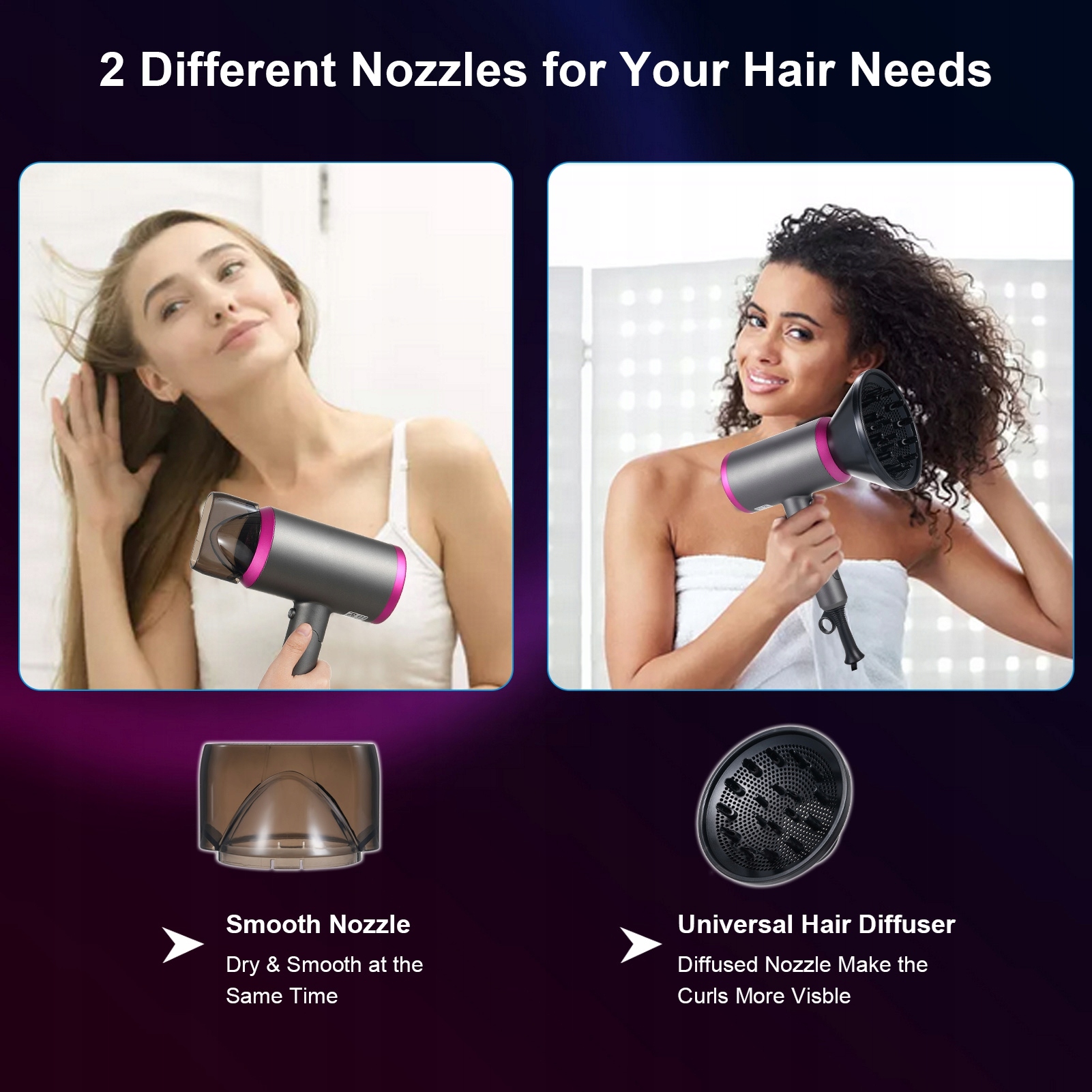4. Приєдналися аксесуари: фен оснащений насадкою концентратора та дифузором, що забезпечує універсальні варіанти стилю для різних волосся та стилів.