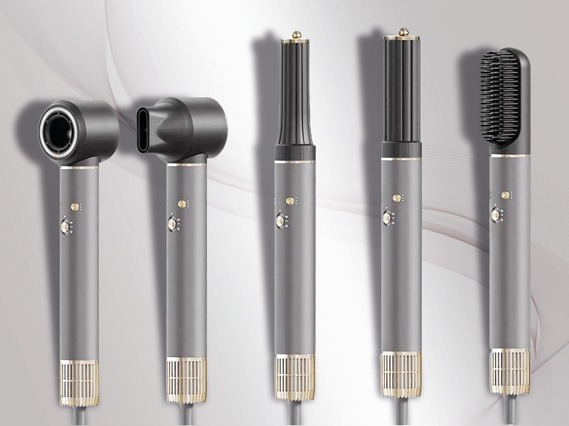 Це означає, що сушарка виконує 5 функцій завдяки замінним порадам. Набір включає: стандартний наконечник сушарки, концентратор, два локони для локонів (30 мм і 40 мм) та щіткою згладжування.