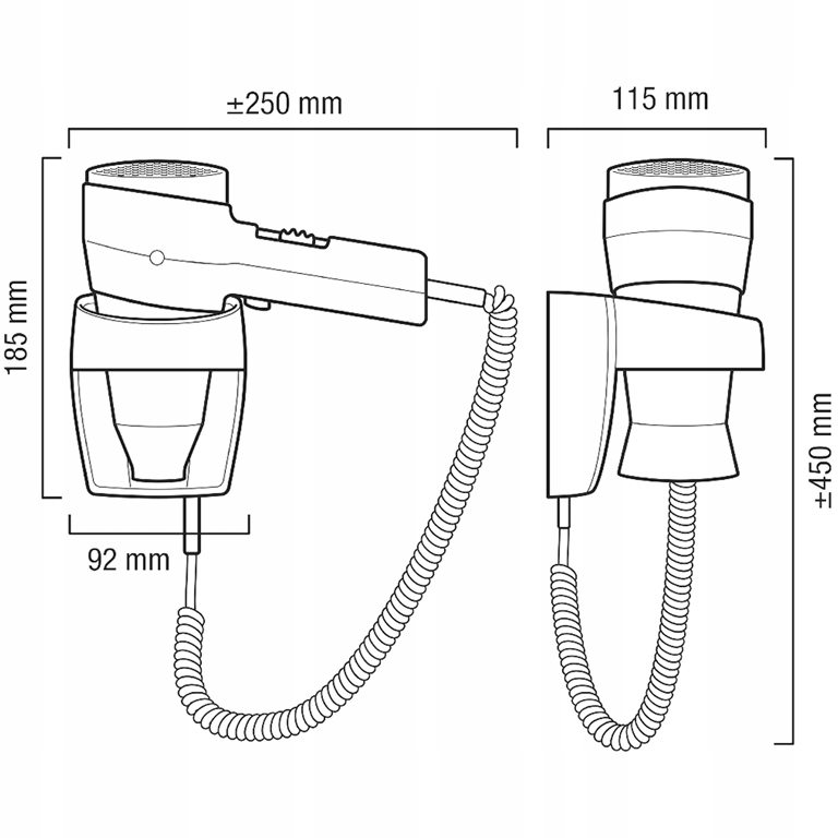 - Розміри сушарки: висота 185 мм (висота з шлангом 450 мм), ширина 250 мм, глибина 115 мм