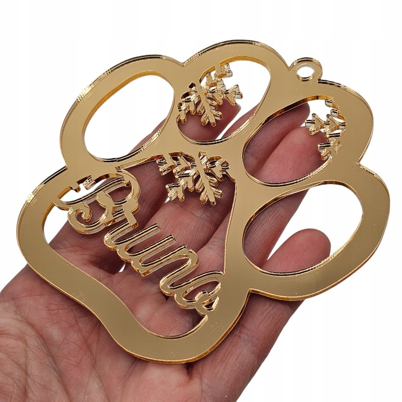 Індивідуальна різдвяна дрібничка для вашого улюбленця — ідеальний спосіб викликати у нього різдвяний настрій! Ця унікальна прикраса, виготовлена із золота, дзеркального матеріалу, має форму милої лапки та тонких декоративних сніжинок, які додають їй елегантності. У центральному місці вирізано ім'я вашої собаки чи кішки, що робить фенечку унікальною та підкреслює, що ваш вихованець є важливим членом сім'ї. Красиво відбиваючи світло, він стане неповторним елементом вашої ялинки та збагатить магію свята.
