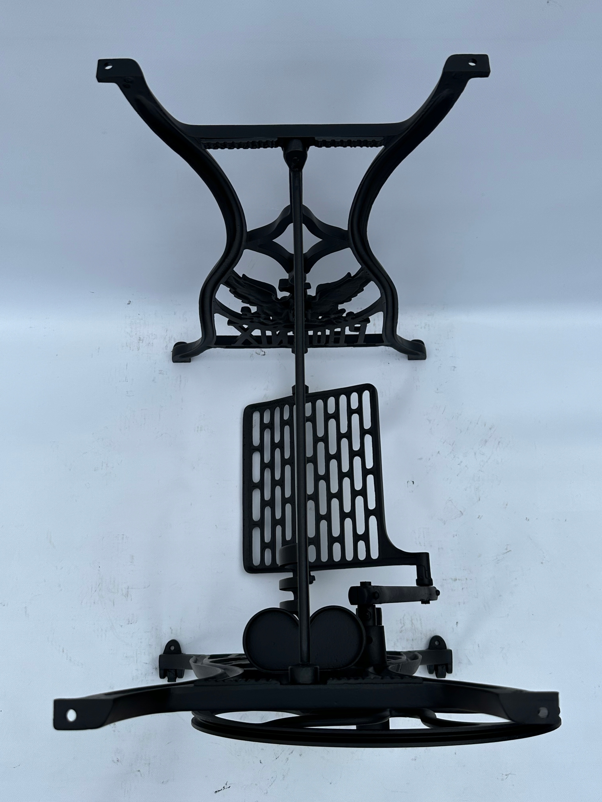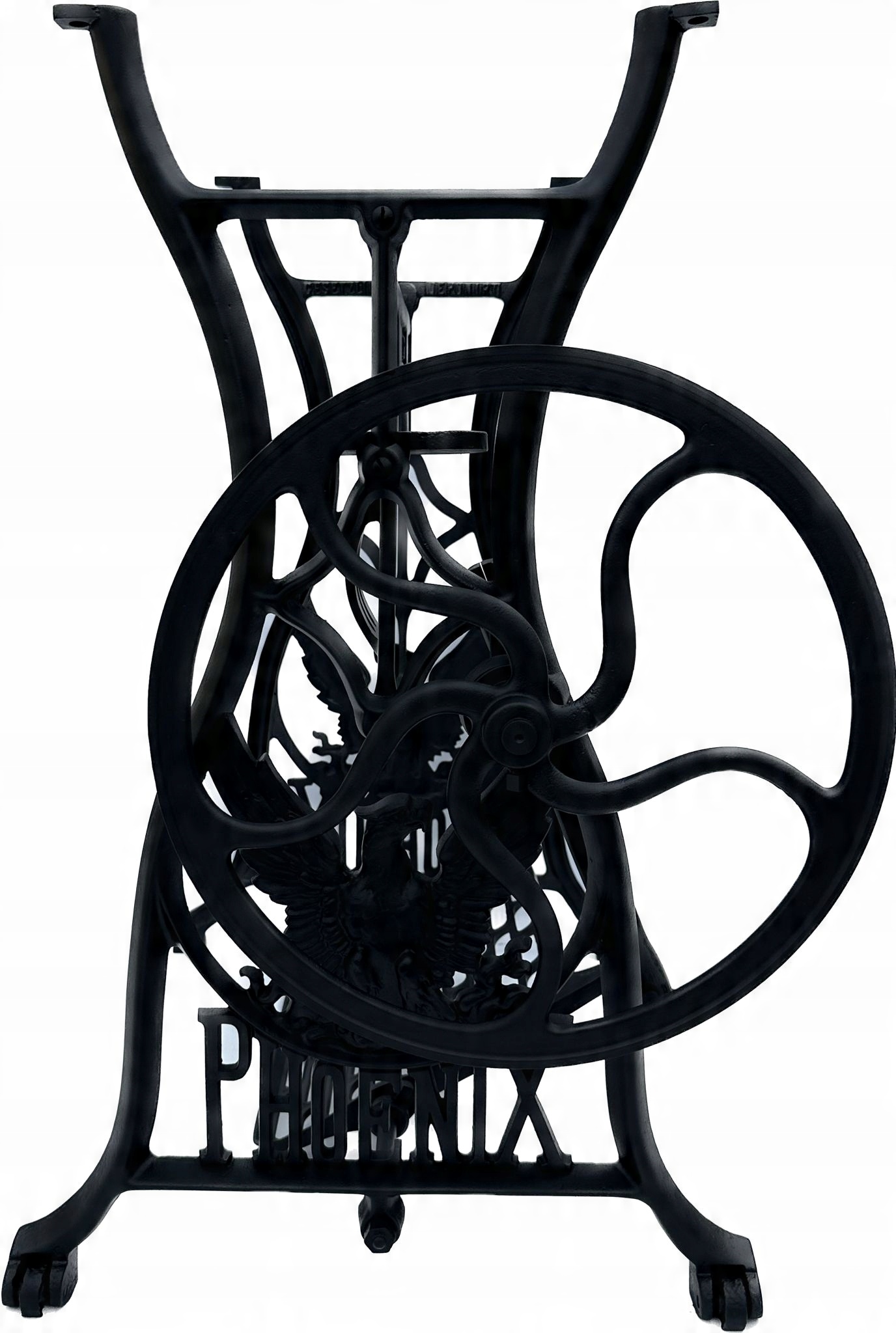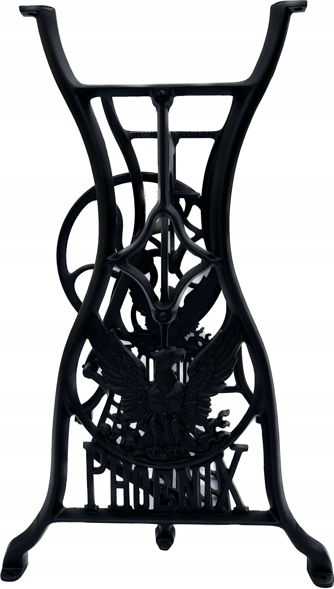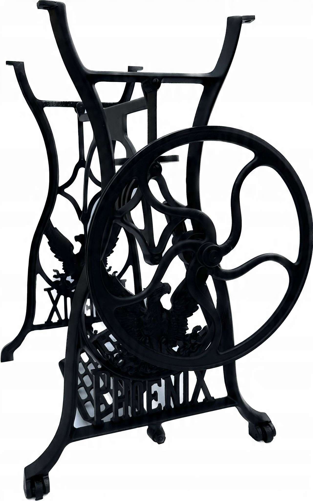 Предмет продажу стара чавунна основа від швейної машинки ФЕНІКС. Дуже гарний візерунок з красивими орлами, зустрічається рідше. З боків написи з логотипом компанії. Він має обидва колеса внизу. У такому багатому оздобленні все важче знайти основу. Це рідкість навіть для колекціонера.