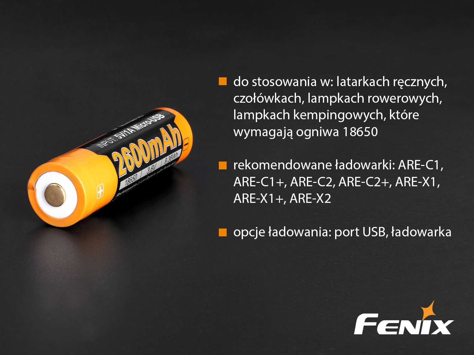 акумулятор, посилання Fenix ARB-L18 -це літій-іонна комірка з реальною ємністю 2600 мАг , створеною для надзвичайно сильних ліхтариків! Ви можете легко використовувати їх де завгодно комірка 18650 з напругою 3.6V . Створений для всіх, хто не любить використовувати традиційні зарядні пристрої, або коли це неможливо. Акумулятор має мікро USB -вхід для зарядки безпосередньо з іншого пристрою. також адаптований для зарядки у зарядних пристроях FENIX.