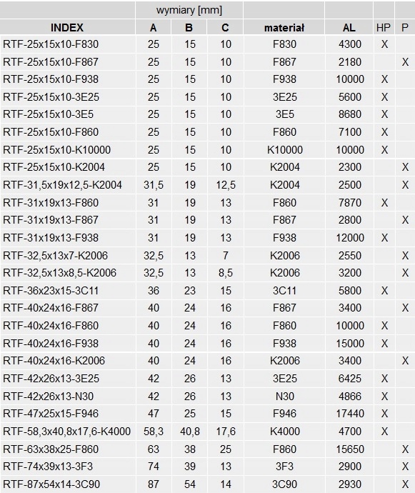Нижче наведено перелік доступних сердечників з матеріалу H10K