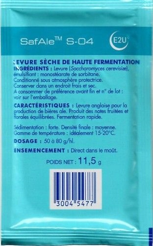Fermentis Safale S -04 - Відомі англійські дріжджі, обрані завдяки високій швидкості бродіння та здатності виробляти дуже компактний осад в кінці бродіння, що сприяє уточненню пива. Дріжджі рекомендували для виробництва широкого спектру пива з елем. Дріжджі рекомендують для виробництва широкого спектру пива.