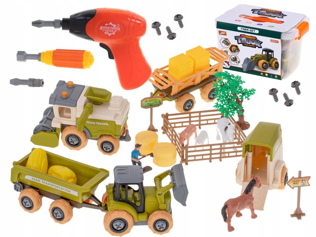 Набір Ферма - це пропозиція для дітей, які люблять життя в сільській місцевості та сільськогосподарських транспортних засобах. Завдяки великій кількості елементів, малюк може створити власні сцени з життя фермера - транспортні культури, корми тварин, використовуйте комбайн та причепи. Гра на фермі розвиває здатність планувати, організацію та логічне мислення , при цьому забезпечуючи багато задоволення.