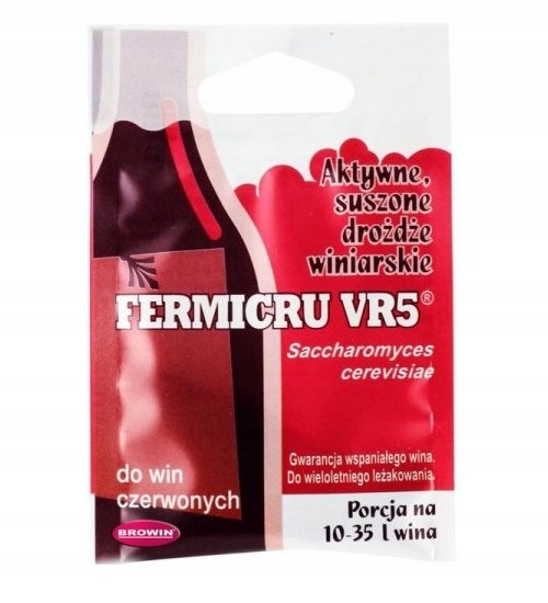 Fermicru VR5 — високоякісні дріжджі для червоних вин. Спеціально відібрані сорти добре справляються з сировиною, яка важко ферментується (наприклад, чорноплідна горобина). Ви також можете використовувати Fermicru VR5, якщо хочете приготувати вино, яке плануєте витримувати багато років. Дріжджі активні, тому розмножувати їх на кілька днів наперед не потрібно. Все, що вам потрібно зробити, це регідратувати його протягом 20 хвилин, перш ніж додати його до суміші. Fermicru VR5 має толерантність до алкоголю приблизно до 15%, тому ви можете приготувати досить міцне вино. З однієї упаковки дріжджів можна приготувати до 35 літрів напою.