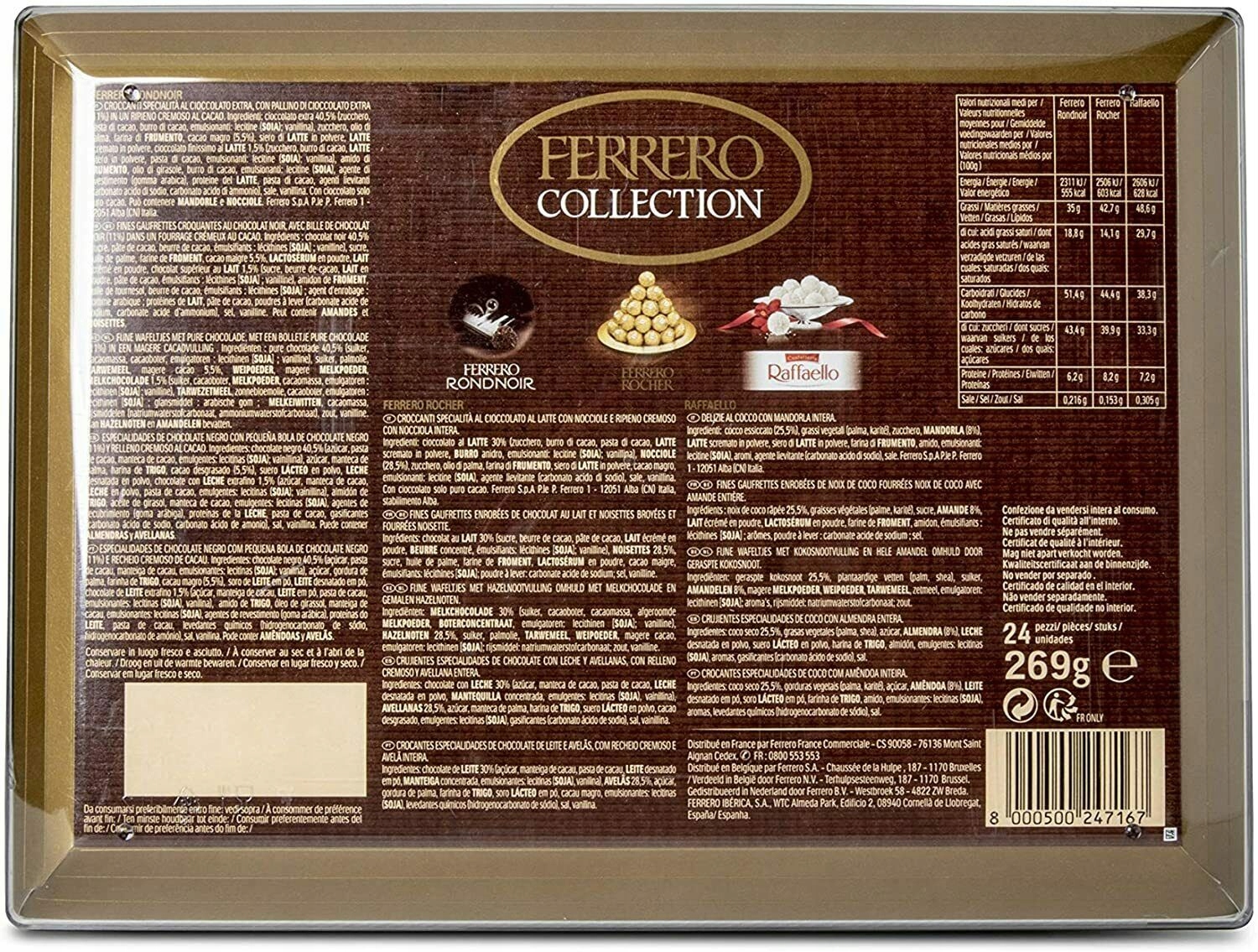 Черний шоколад Ferrero rondnoir 40,5% (цукор, какао терте, какао-масло, емульгатор: лецитини (соєві); ванілін), цукор, пальмова олія, пшеничне борошно, нежирний какао-жир вміст (5,5%), суха молочна сироватка, сухе знежирене молоко, молочний шоколад (цукор, какао-масло, незбиране сухе молоко, какао терте, емульгатор: лецитин (соя); ванілін), пшеничний крохмаль, соняшникова олія, какао-масло, емульгатор: лецитин (соя), глазурувальник (гуміарабік), молочні протеїни, какао терте, розпушувачі (бікарбонат натрію, гідрокарбонат амонію), сіль, ванілін. може містити мигдаль і фундук молочний шоколад ferrero rocher 30% (цукор, какао-масло, какао терте, сухе знежирене молоко, дегідратоване масло, емульгатор: лецитини (соєві); ванілін), фундук (28,5%), цукор, пальмова олія, пшеничне борошно , суха молочна сироватка, нежирний какао-порошок, емульгатор: лецитини (соєві); розпушувач (бікарбонат натрію), сіль, ванілін рафаелло, сушений кокос (25,5%), рослинні жири (пальма, ши), цукор, мигдаль (8%), сухе знежирене молоко, суха сироватка, пшеничне борошно, крохмаль тапіока, емульгатор: лецитини (соєві), ароматизатори, розпушувач (бікарбонат натрію), сіль.