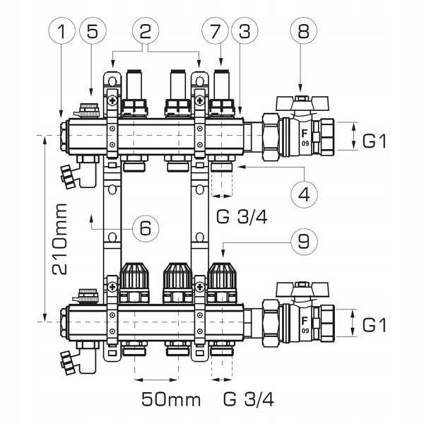 - термостатичні клапани на балці зворотної лінії, оснащені ручками для ручне регулювання з можливістю підключення головки термоелектричної (9)