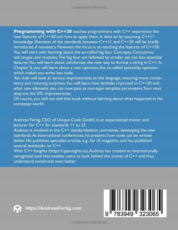 Програмування з C ++ 20 навчає програмістів з C ++ досвіду нових функцій C ++ 20 та як їх застосувати. Це робить, припускаючи, що C ++ 11 знає. Елементи стандартів між C ++ 11 та C ++ 20 будуть коротко введені, якщо NCESSARY. Howver, увага зосереджена на викладанні особливостей C ++ 20. Ви почнете з того, щоб дізнатися про так звані чотири поняття, корути, std :: діапазони та модулі. Великі четвірки супроводжуються меншими, але не менш важливими ознаками. Ви дізнаєтесь про STD :: Формат, новий спосіб форматування рядка в C ++. У розділі 6 ви дізнаєтесь про нового оператора, так званого оператора космічного корабля, який змушує вас писати менше коду. Потім ви розглянете різні вдосконалення мови, забезпечуючи більше узгоджень та зменшення сюрпризів. Ви дізнаєтесь, як вдосконалені лямбда в C ++ 20 та які нові елементи ви тепер можете пройти як параметри шаблону, що не є типом. Наступна ваша зупинка - вдосконалення STL. Звичайно, ви не закінчите цю книгу, не дізнавшись про те, що сталося в Confstexpr-OWW.