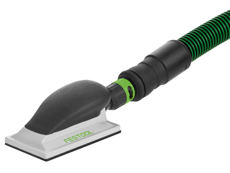Ручний шліфувальний блок із відведенням пилу ідеально підходить для шліфування кутів або важкодоступних місць на шпаклівці. Потужність всмоктування можна оптимально регулювати за допомогою байпасного керування. Завдяки заокругленим кутам підкладки на липучках не ушкоджуються оброблені поверхні. Ергономічна ручка запобігає утворенню пухирів на руках. Завдяки вбудованому адаптеру можна використовувати з усмоктувальними шлангами Festool.