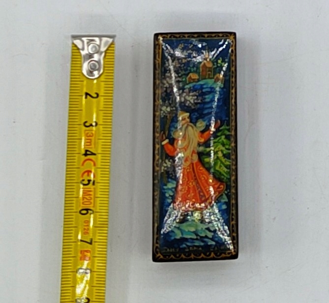 Вся ця ручна робота. Розміри: 8 см/3 см/3 см, вага 28 грам. Зроблено з дерева, сміявся, зафарбований вручну, обережно прикрашений навколо золота. Це вікова скринька, як ви бачите. Суцільно зроблений, на петлях кришка добре складена. Він використовувався для зберігання ювелірних виробів. Live виглядає так само красиво, як на знімках. Вона крихітна, колекціонер. Рекомендую!