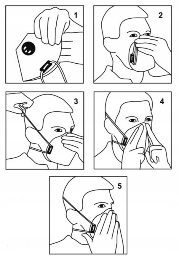 5. Перевірити правильність установки; з’єднати руки і триматися за навіс; сильно видувати повітря. У разі протікання відрегулюйте положення навісу, затиску для носа або пов’язки.