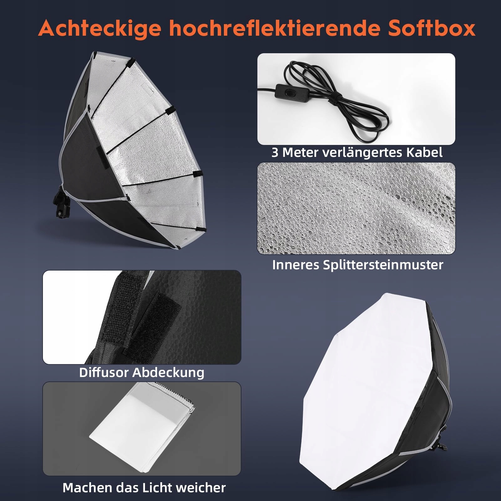 Восьмикутна структура софтбоксу (50 см) забезпечує рівномірне та природне розсіювання світла, усуваючи різкі тіні. Завдяки цьому фотографії та записи набувають професійного характеру з тонким відображенням світла в очах моделі.