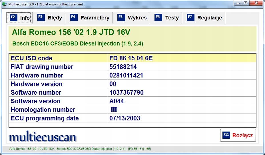 Приклад роботи інтерфейсу в зв’язку з автомобілем Alfa-Romeo 156 1.9 JTD 16v 2004 на Windows 7 64-bit у співпраці з програмою MultiECUScan 2.0 (програма доступна повністю польською мовою).