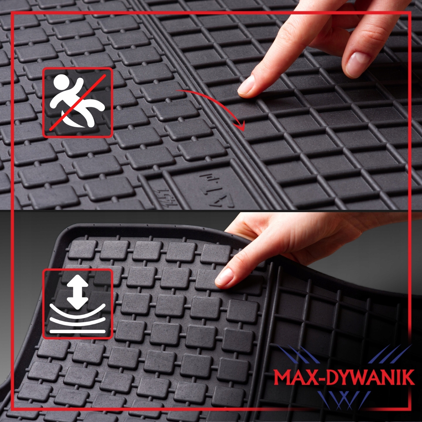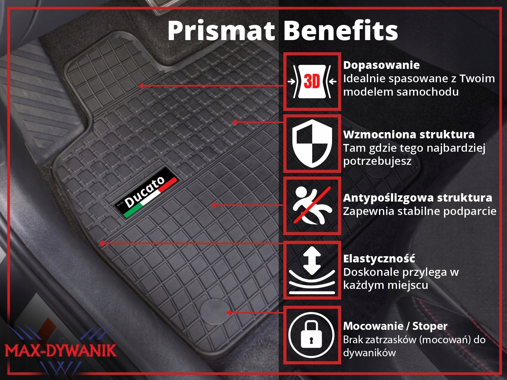 3D-мітки були розміщені на спеціально розроблених кріпленнях Max-Dywanik, які, як і килими, стійкі до води, бруду та погодних умов. Розкішна етикетка з описом відповідності призначення килимків моделі автомобіля виготовлена за допомогою цифрового друку, який залитий смолою, що надає йому унікальний ефект. Все це було встановлено на спеціальних кліпсах Max-Dywanik, які кріплять етикетки до килимків, не допускаючи потрапляння води. Естетичне виконання виглядає надзвичайно привабливо. що полегшує пошук і встановлення правильних килимків у вашому автомобілі.