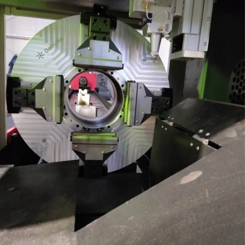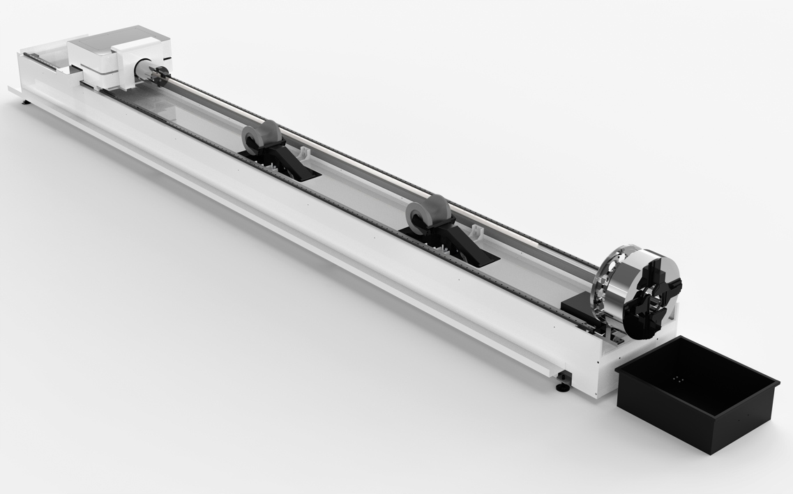 • Поворотна для труб і профілів, максимальна довжина 6030 мм, оснащена автоматичним, пневматичним, саморегулюючим центруюча ручка. Програма для різання профілю дозволяє виправляти центрування на вибраних ділянках, введених у програму. (це полегшує роботу з криволінійними профілями)