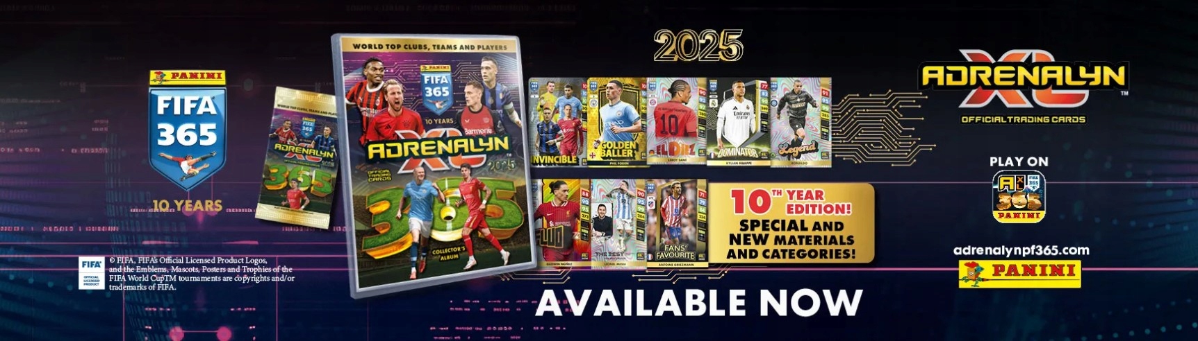 PANINI FIFA 365 ADRENALYN >PANINI FIFA 365 ADRENALYN XL™! Цього року, з нагоди 10-річчя серіалу, ми підготували для вас щось нове та унікальне. Ось що чекає на вас у випуску 2025 року...