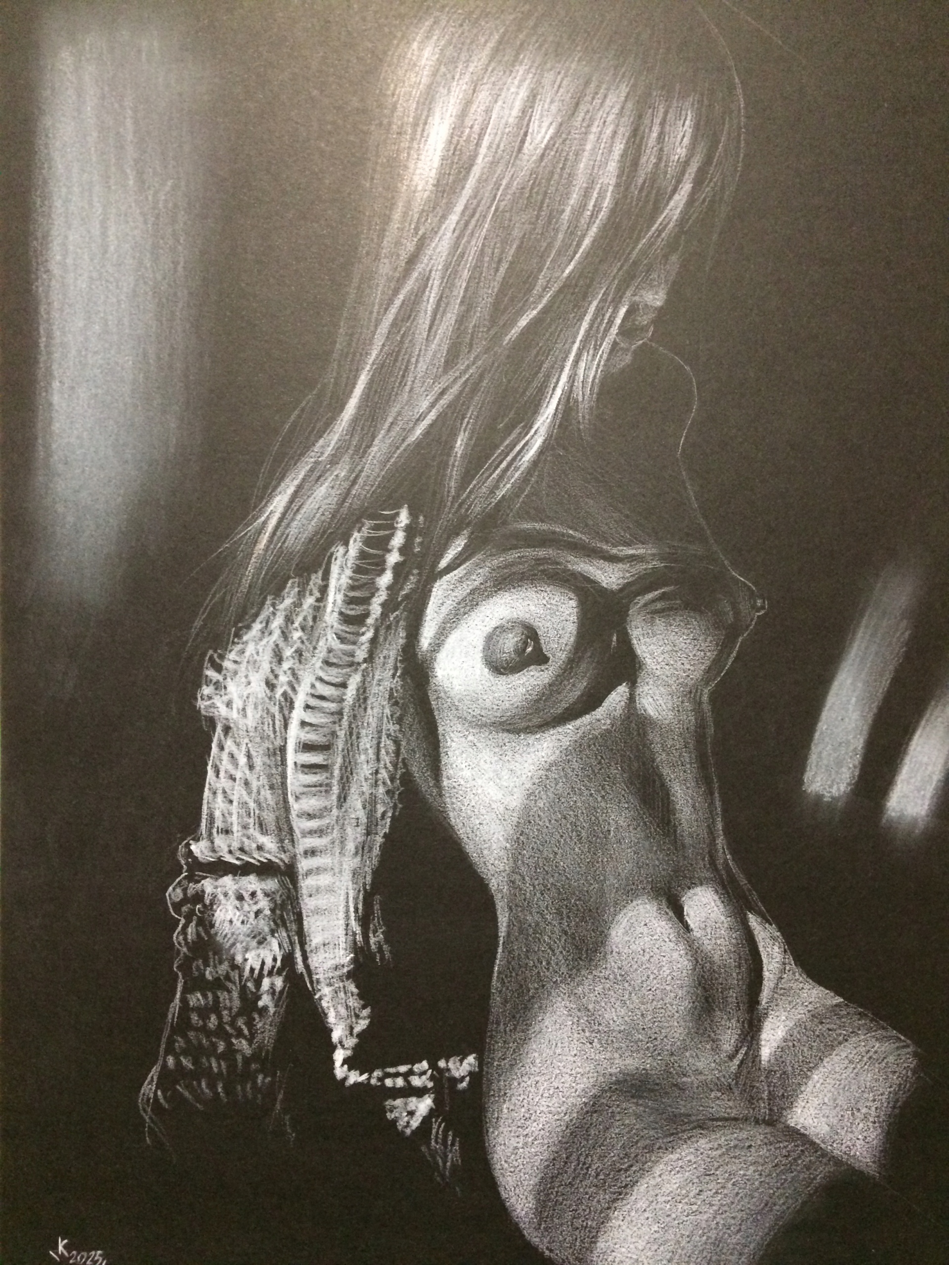 - Матеріал: Білий вугілля "Conté à Paris", чорний папір "Фабріано" 200Mg Лі> Ойнт. ". Виготовлений з високоякісного білого олівця. На чорному папері. Це забезпечує довговічність та красу. Ідеально підходить для оздоблення інтер'єру, додавання витонченості та стилю. Ідеальний подарунок для любителів мистецтва та краси.