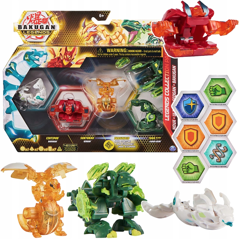 Колекційний набір Bakugan Legends включає все, що вам потрібно для битв, прямо з коробки! Включає 4 бакугани, колекційні карти персонажів і здібностей, карти воріт тощо! Ваша колекція іграшок Bakugan стала ще сильнішою, ніж будь-коли, завдяки сяючому Bakugan Nova! Дивіться світлове шоу, ковзаючи ними по BakuCores (6 на комплект)! Дивіться, як ваш Бакуган відкривається і перетворюється на фігуру лютої істоти. Грайте за Геогана під час боїв і виконуйте несподівану атаку, щоб перемогти суперника! Різноманітність героїв забезпечить неймовірну бойову шкоду, як ніколи раніше. Використовуйте включені картки навичок, щоб отримати ще більше можливостей грати та заробляти бонуси на арені Bakugan Battle!