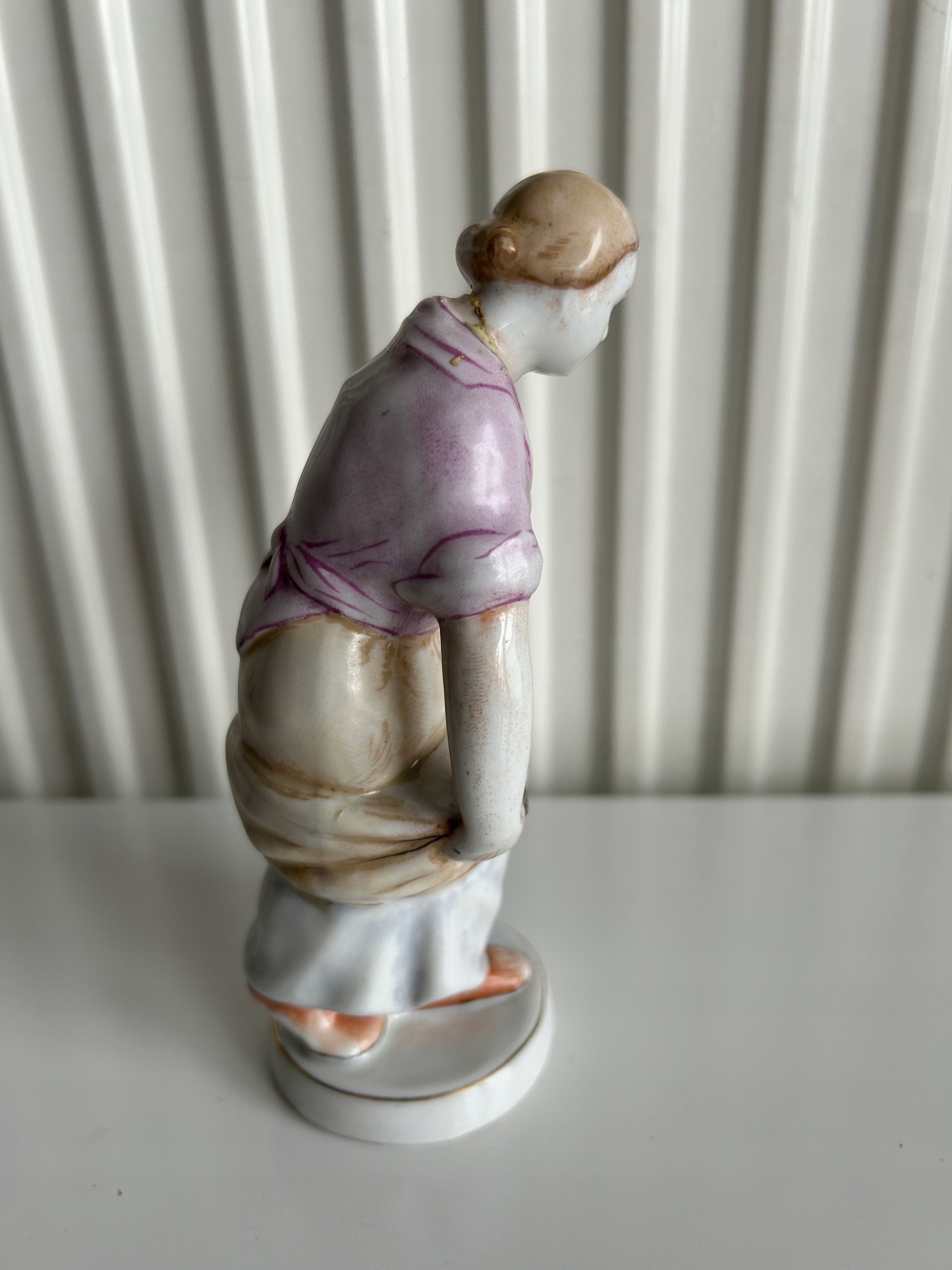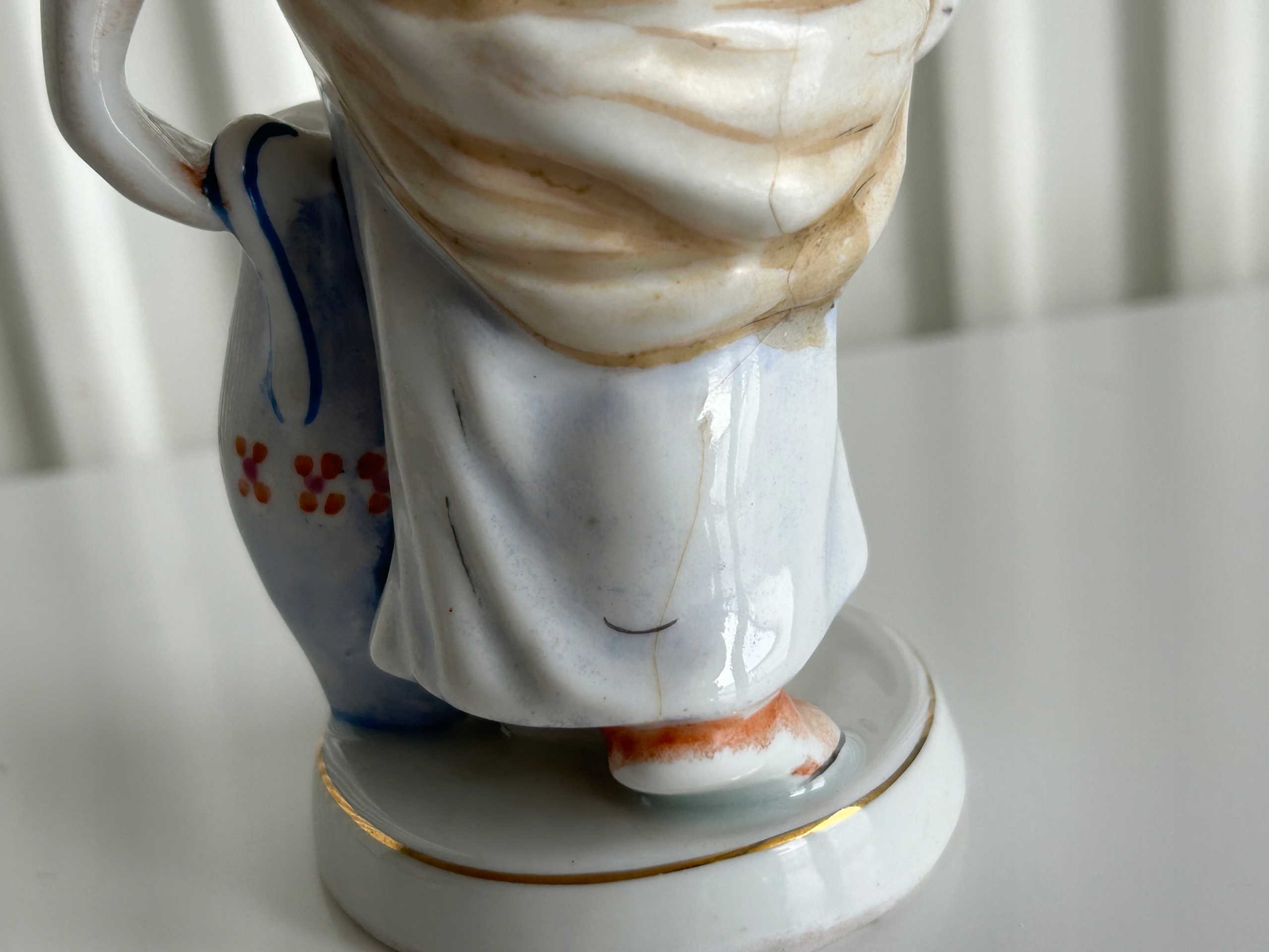 фігурка має приклеєну голову, відремонтовану клеєм Distal у 1980-х роках