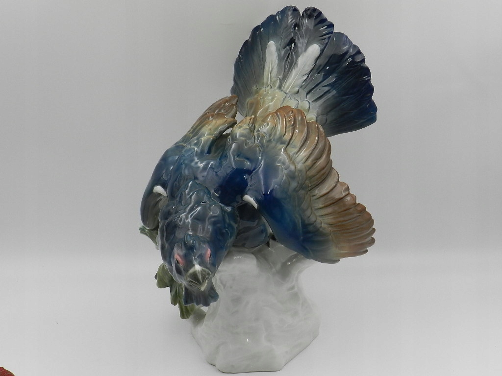 Красива велика фігура глухаря, який спаровується, сидить на присадкуватому тулубі з опущеною головою, розпущеним хвостом і злегка розчепіреними крилами. Статуетка виготовлена з надзвичайною ретельністю, відтворюючи найдрібніші деталі як за формою, так і за кольором, створюючи враження майже живої. Рідкісний екземпляр за розміром.