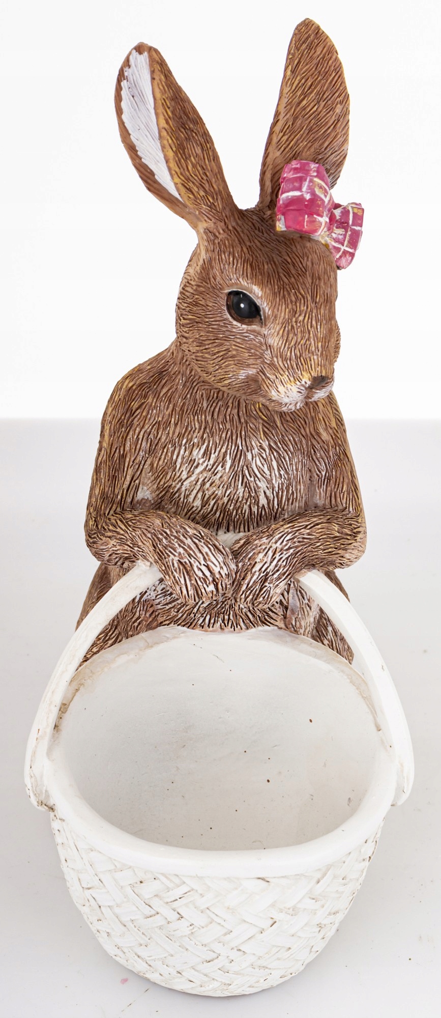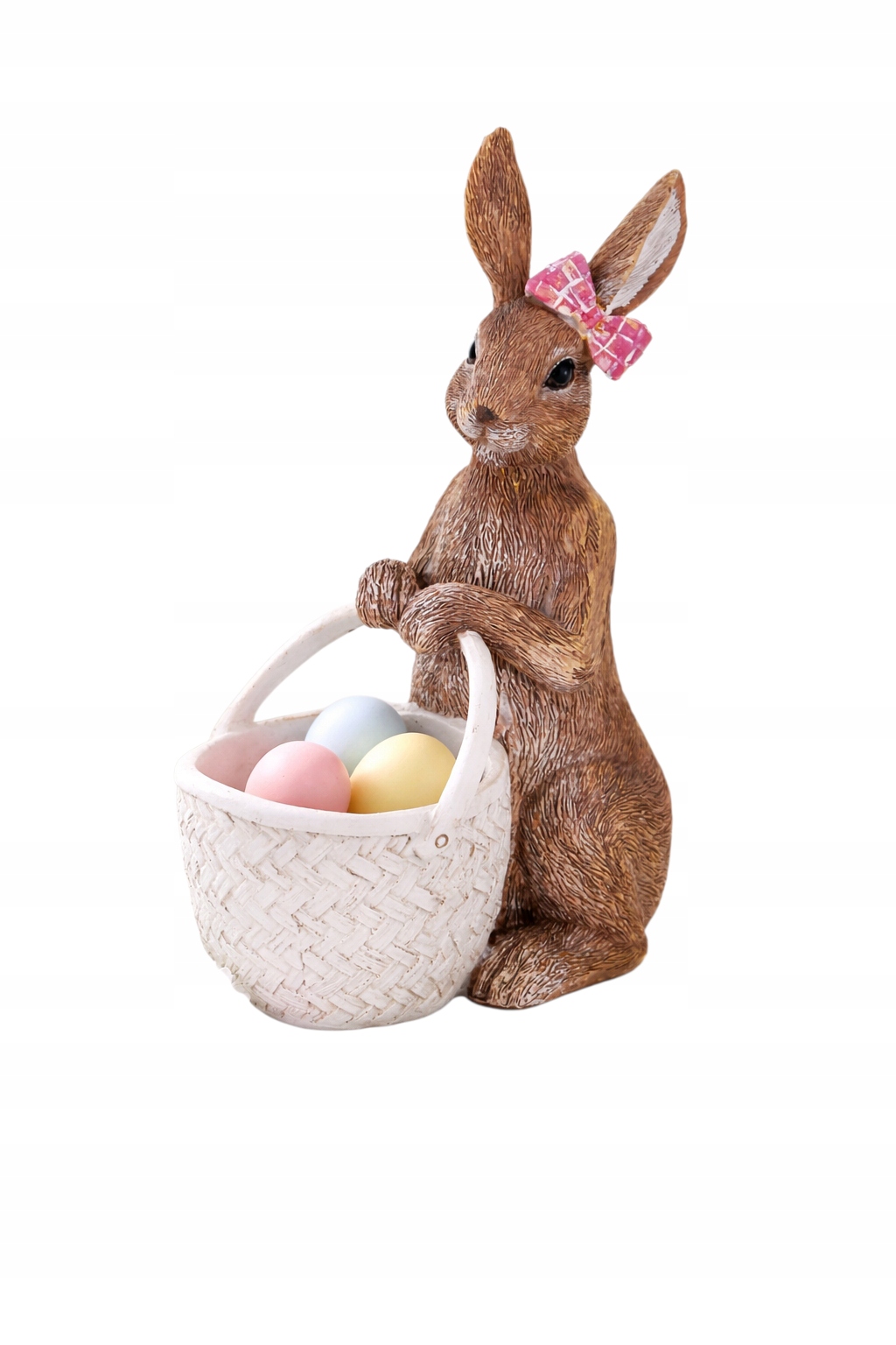 Зайчик тримає плетений кошик, який можна використовувати для виставлення великодніх яєць, солодощів або дрібних прикрас. Ретельно виготовлені деталі та витончений бантик додають фігурці неповторний шарм.