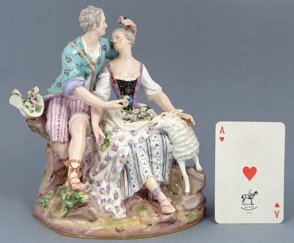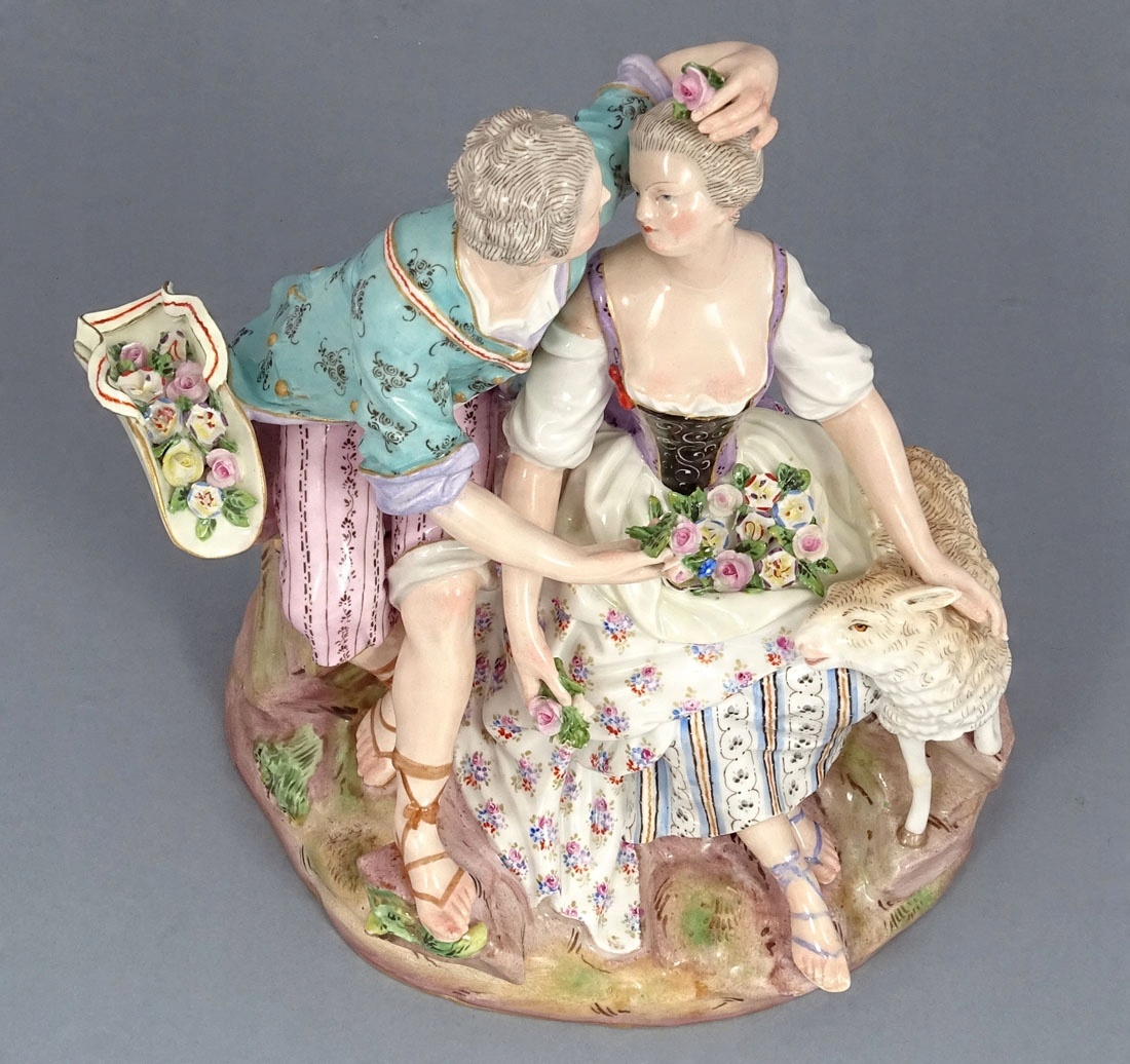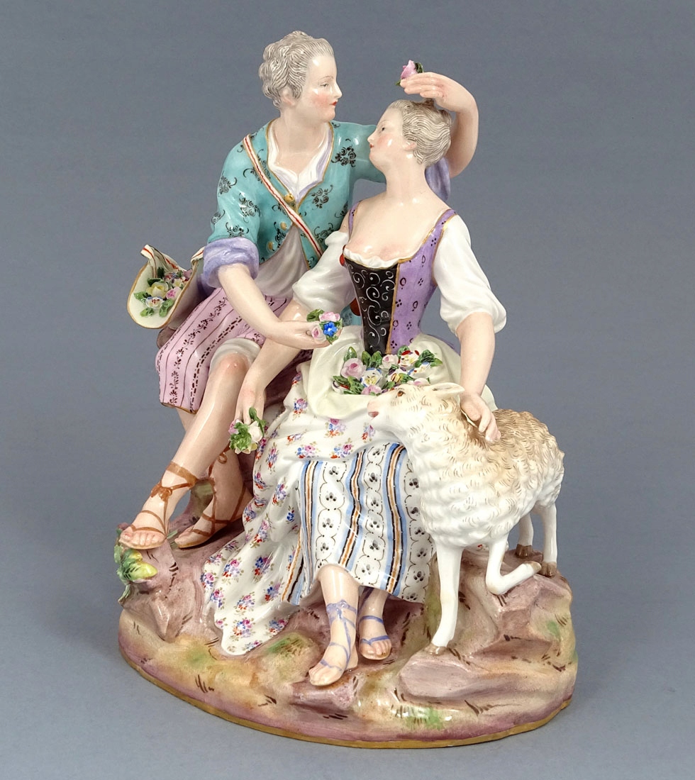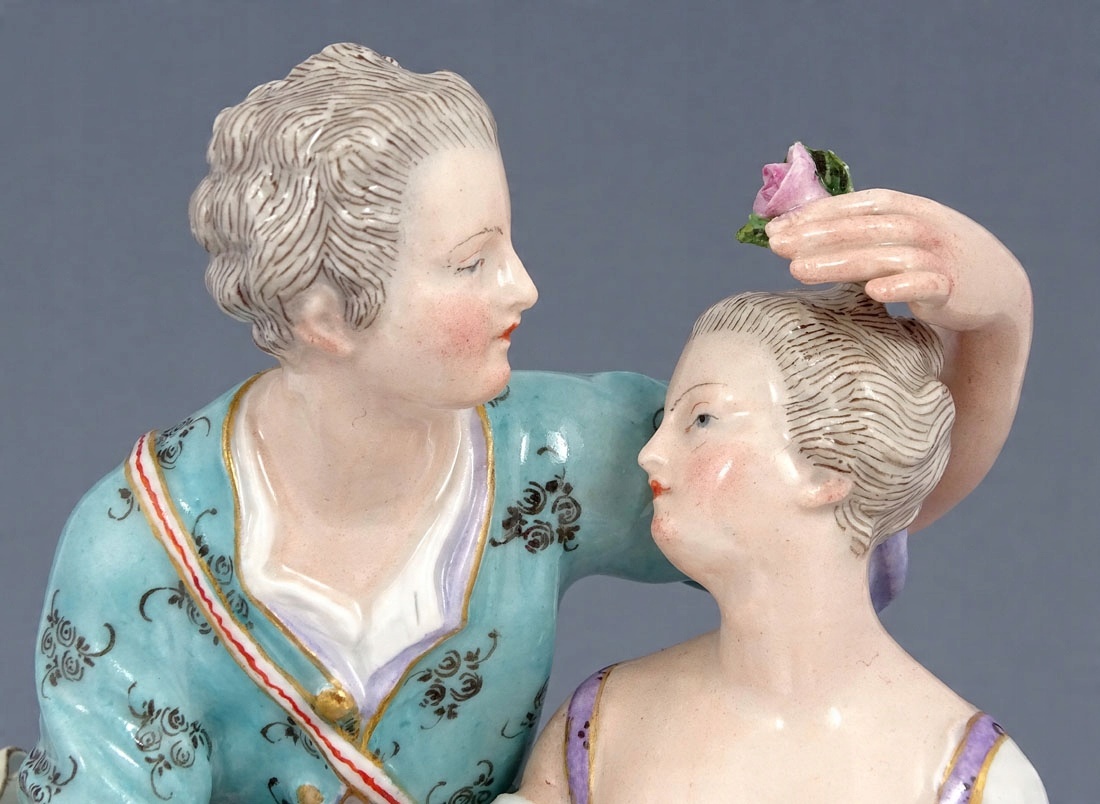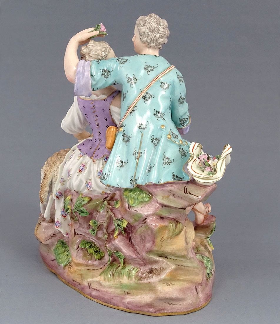 поставлена на овальну основу з великими каменями, які служать місцем для відпочинку. Пара в елегантному барвистому одязі з босоніжками на ремінцях. Поруч з жінкою стоїть баранчик, а біля чоловіка — кошик із квітами. Квіти також розташовані на сукні дами та в руках джентльмена, який лівою рукою намагається приколоти квітку до волосся коханої.