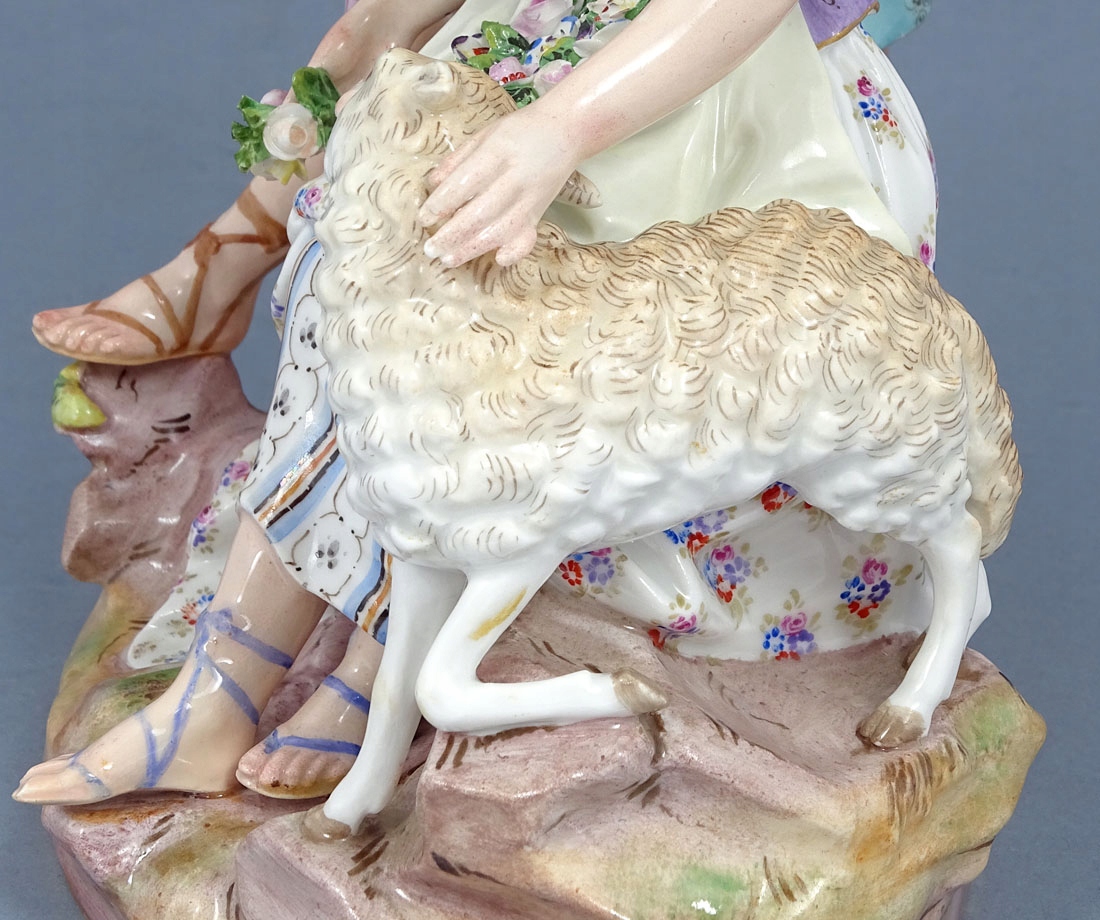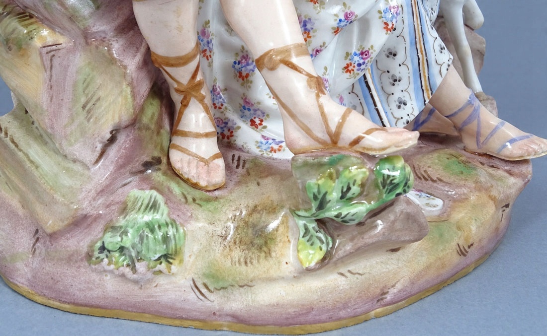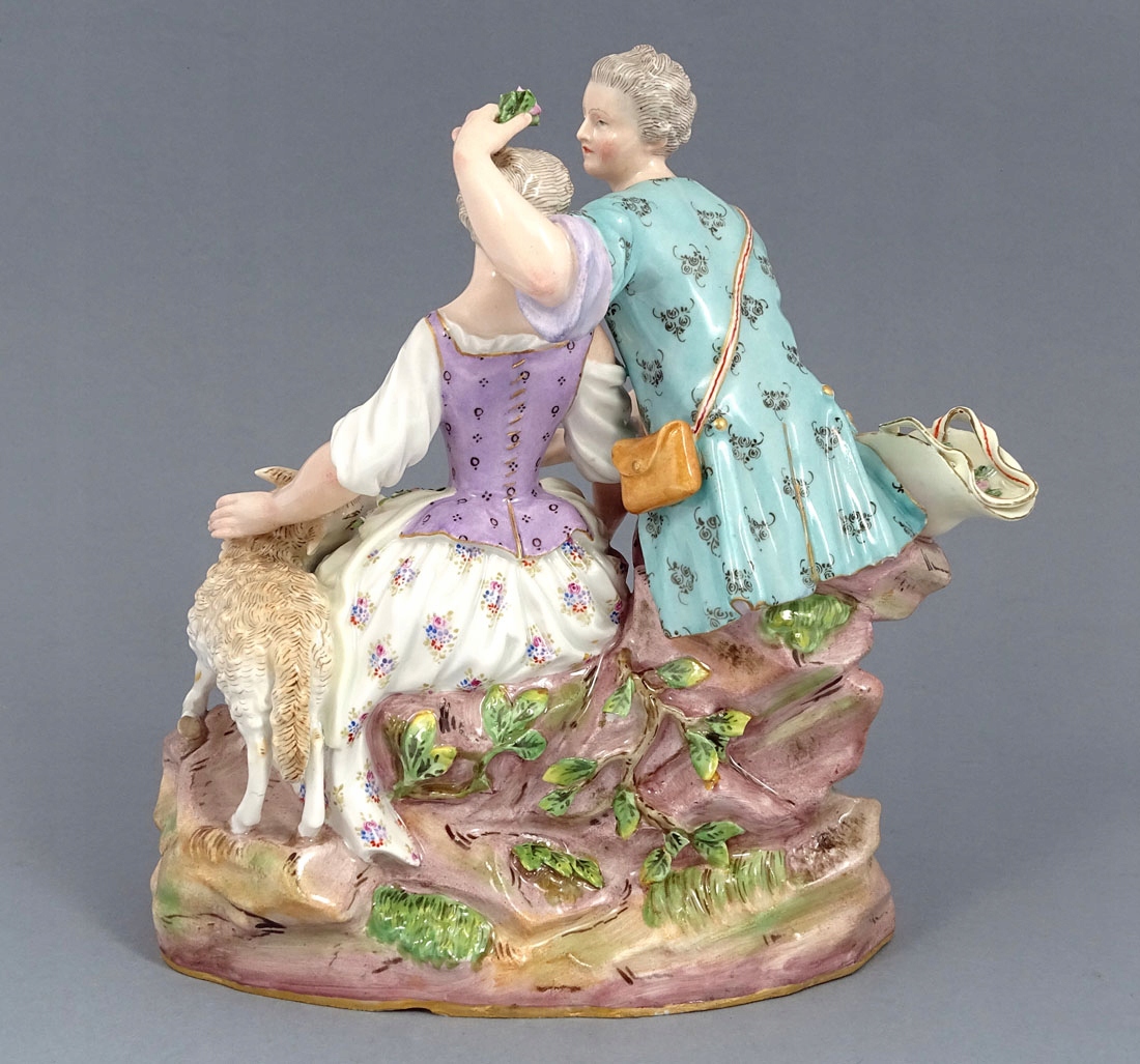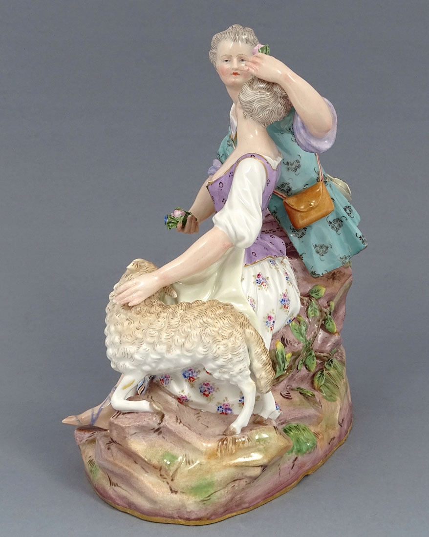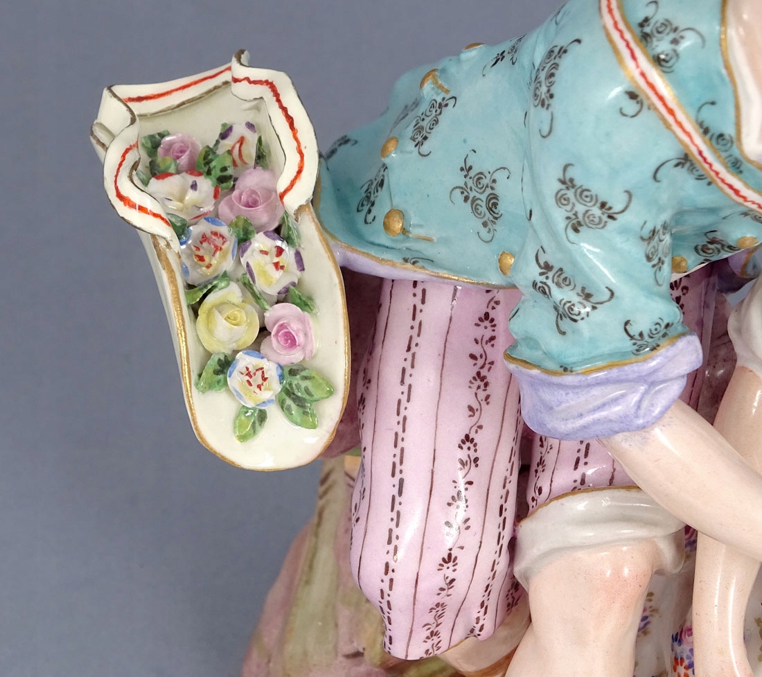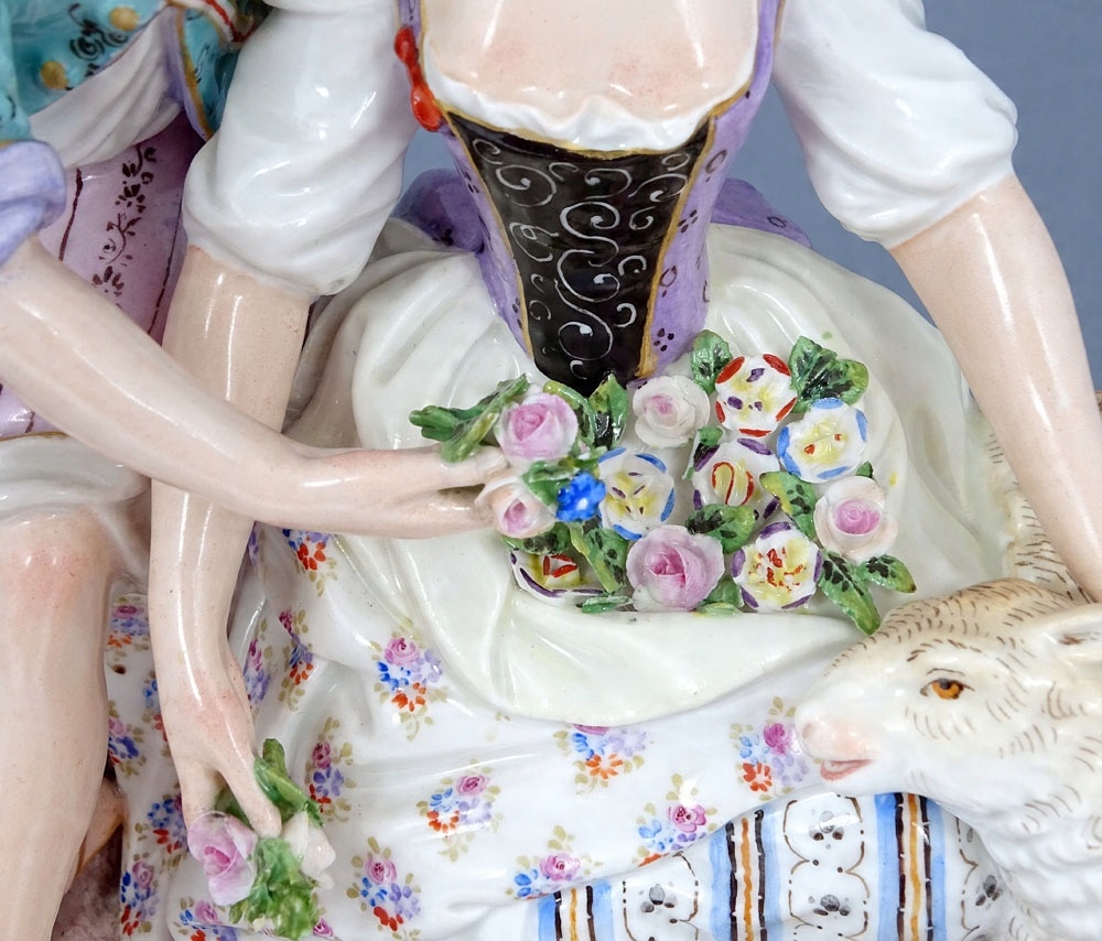 поставлена на овальну основу з великими каменями, які служать місцем для відпочинку. Пара в елегантному барвистому одязі з босоніжками на ремінцях. Поруч з жінкою стоїть баранчик, а біля чоловіка — кошик із квітами. Квіти також розташовані на сукні дами та в руках джентльмена, який лівою рукою намагається приколоти квітку до волосся коханої.