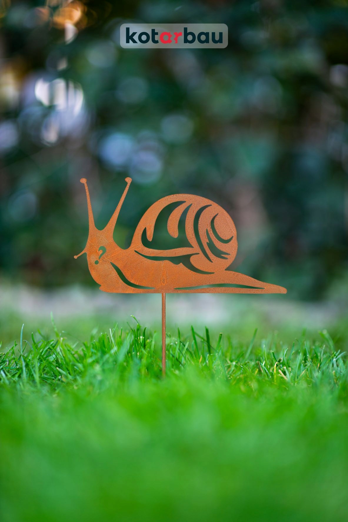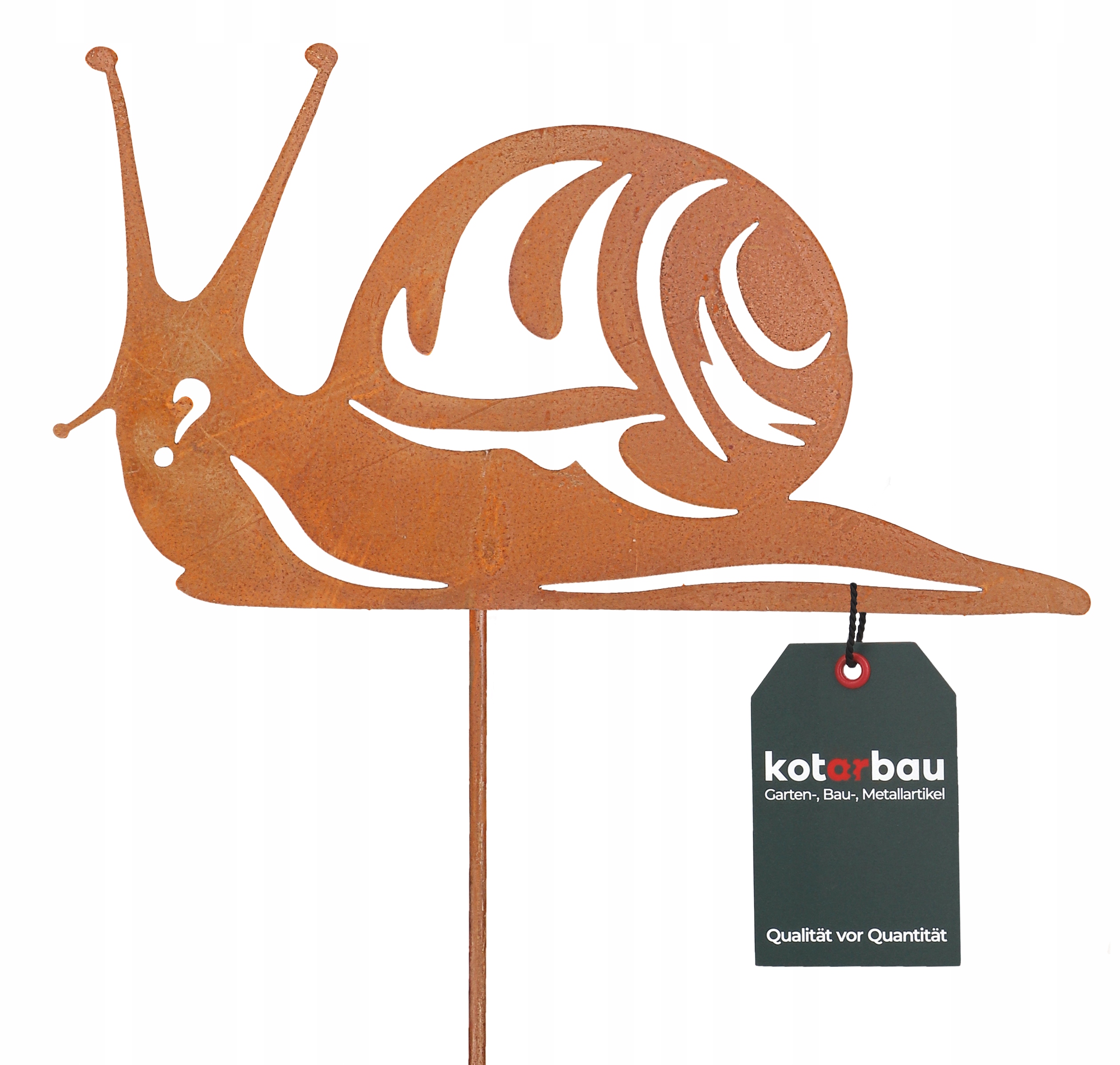 - Равлик, вистрілений з листового металу на стрижні, є виготовлений з листового металу ROST, що надає йому злегка іржавий колір, завдяки чому він ідеально вписується в зелень саду.