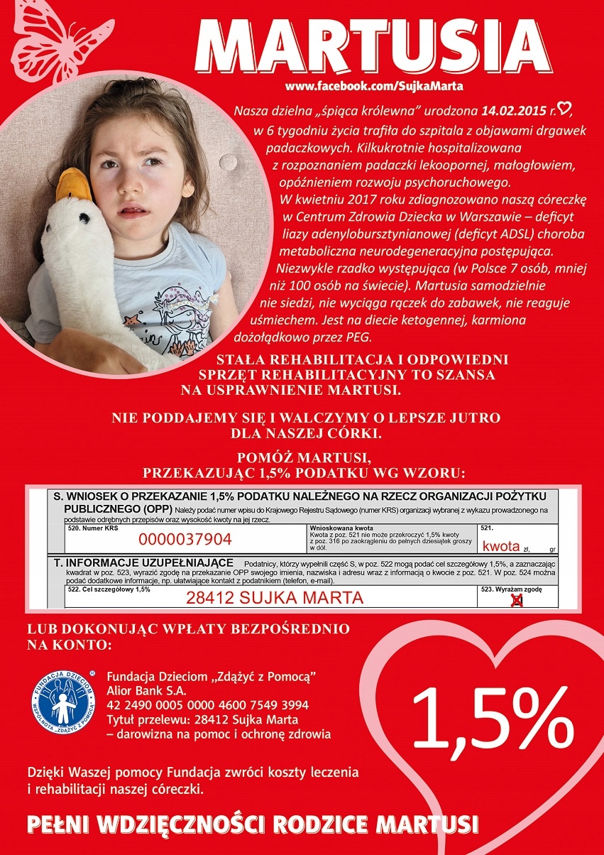хоробра принцеса кілька разів госпіталізована через виникаючі епілептичні стани, судоми, що відбуваються до чотирьох годин (винищування та ноги) за 16 місяців життя, медичний центр у Варшаві був включений до Центру здоров'я дітей - відставки припадків з подальшим погіршенням стану та тяжкості нападів. Діагностика весь час проводилася для діагностики захворювання, у неї була біопсія стегна. Через епілептичні припадки, що відбуваються весь час, було вирішено лікувати кетогенну дієту, для якої ми були підготовлені, і особливо Мартусія, і з 03.2017 ми перебуваємо на кетогенній дієті. Поліпшення відбулося в перший місяць дієти, тоді як протягом двох місяців відбулася регресія та тяжкість припадків, які відбуваються після кожної прокидання нашої принцеси. PEG також був заснований (дивертикулярний годування), щоб він міг отримувати їжу, оскільки судоми спричинили, що немає сил приймати їжу. Ми не здаємося, ми працюємо весь час, розраховується тут і зараз. Реабілітація та використання різних трудових терапій, заняття з неврологією, терапія годування була і необхідною для того, щоб допомогти нашій прекрасній принцесі. Ми постійно переконуємось, що ми подолаємо хворобу і що принцеса зможе відчути красу цього світу.