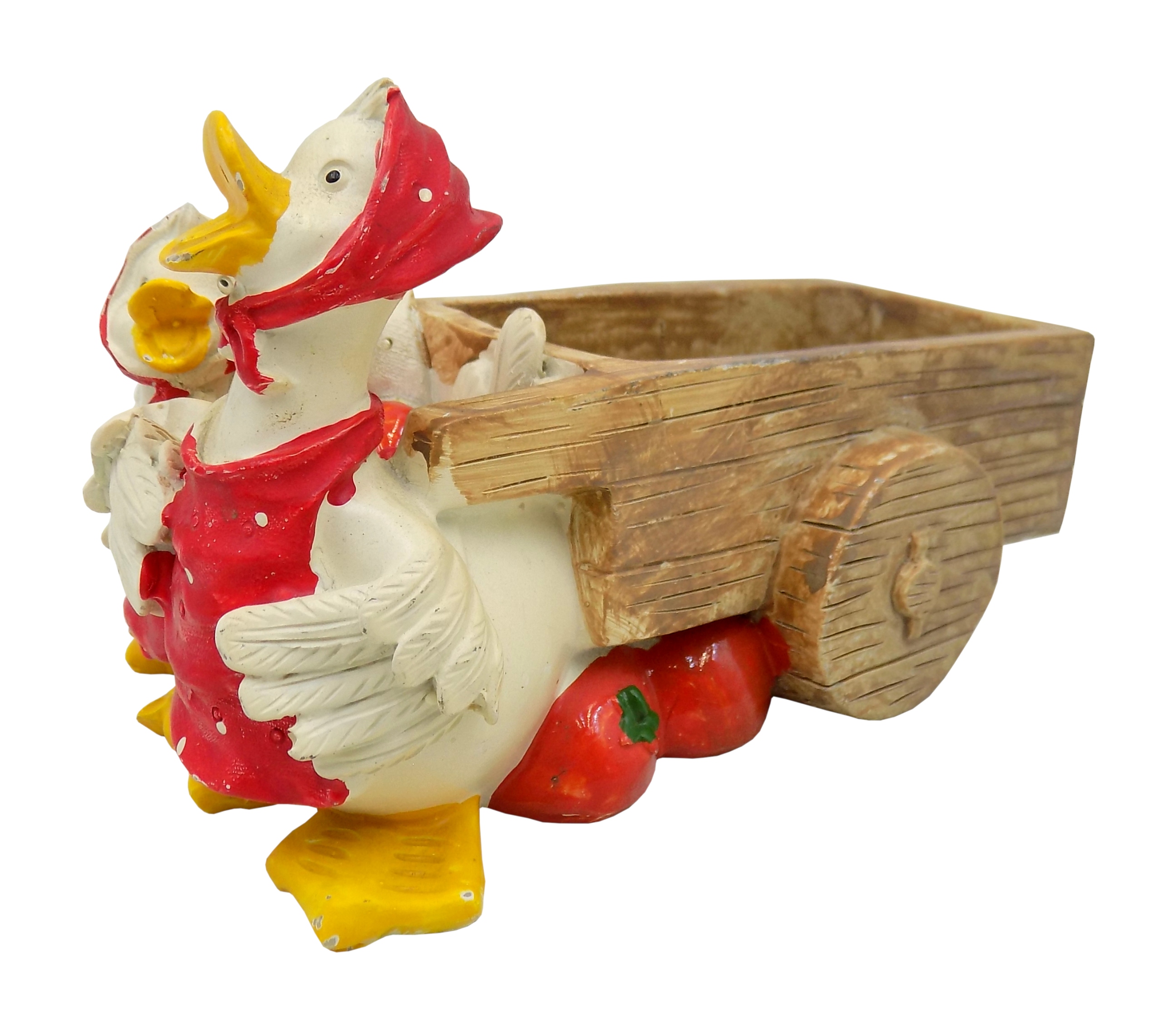 Пара качок, що тягнуть візок, прикраса з якогось композитного матеріалу. Розміри; висота 9,5 х 16 х 10 см.
