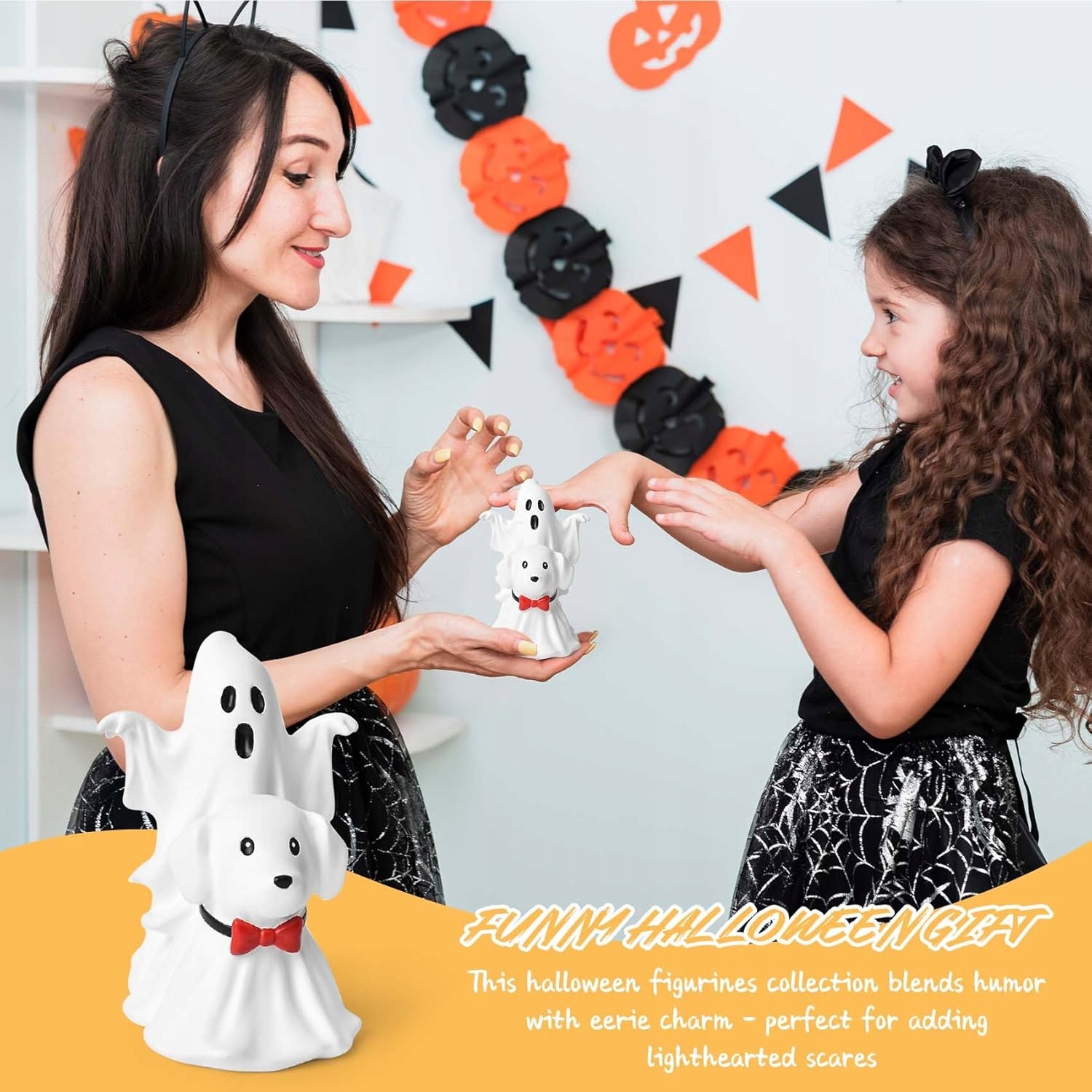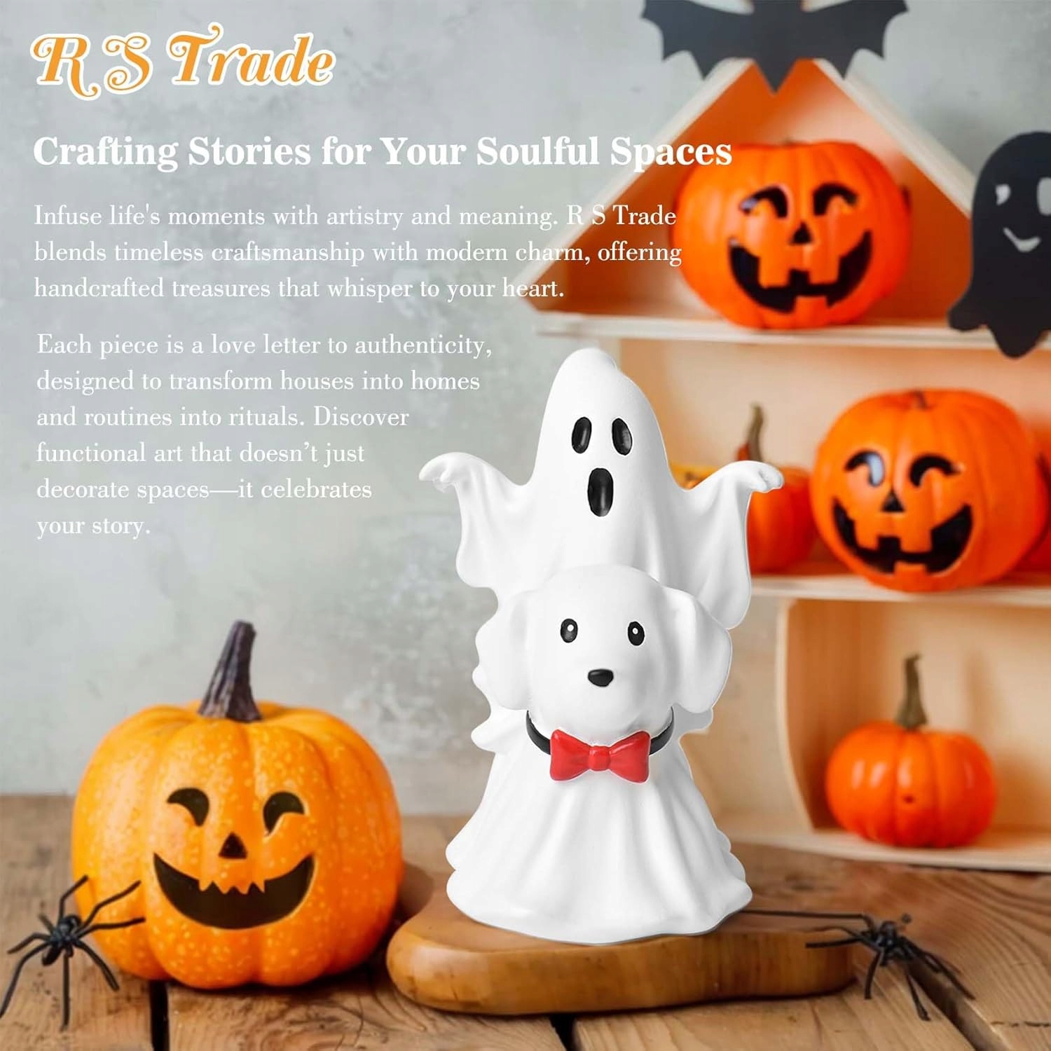 Прикраса показує пустотливий дух, що йде на елегантну собаку в краватці, зробленому з тривалої смоли. Це ручна деталь, яка поєднує гумор з кліматом на Хеллоуїн.