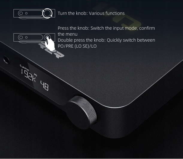 Багатофункціональна ручка гучності K11 R2R використовується для ввімкнення та вимкнення пристрою, роботи з меню, регулювання гучності та інших функцій. Диск розроблено таким чином, що ви можете швидко виконувати різноманітні складні дії, просто натискаючи та повертаючи диск. Ви також можете швидко перемикатися між режимами PO/PRE (LO SE)/LO*, подвійним натисканням диска, що полегшує правильне підключення до різних налаштувань аудіо.