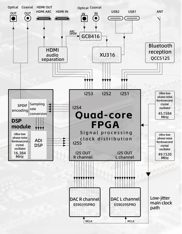 Вперше в продукті FIIO K19 використовує потужну чотирьохядерну FPGA як центр високого рівня -роздільна здатність цифрової обробки сигналів. FPGA відповідає за обробку всіх вхідних цифрових сигналів, включаючи прийом і декодування Bluetooth, декодування USB, коаксіальне та оптичне декодування, декодування HDMI/ARC і цифрову обробку сигналу DSP. Ці цифрові сигнали безпосередньо передаються через два набори каналів I2S на подвійний ЦАП ES9039SPRO, забезпечуючи мінімальне спотворення та втрату аудіосигналів у ланцюжку обробки цифрового звуку.