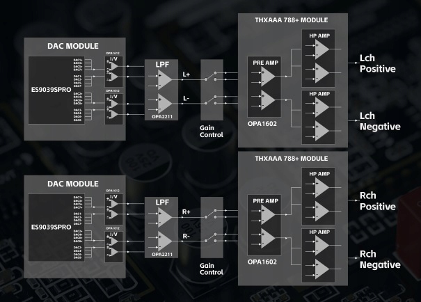 K19 обробляє аудіосигнали в повністю диференційованому тракті - від подвійних ЦАП через перетворення I/V, фільтрацію низьких частот до збалансованого підсилювача для навушників, щоб забезпечити високу динаміку та мінімальні перехресні перешкоди. Крім того, різні частини аудіосхеми, такі як IV, LPF і попередній підсилювач, використовують кілька точних операційних підсилювачів, включаючи OPA2211 і OPA1602, щоб гарантувати, що K19 створює стабільний високоякісний звук.
