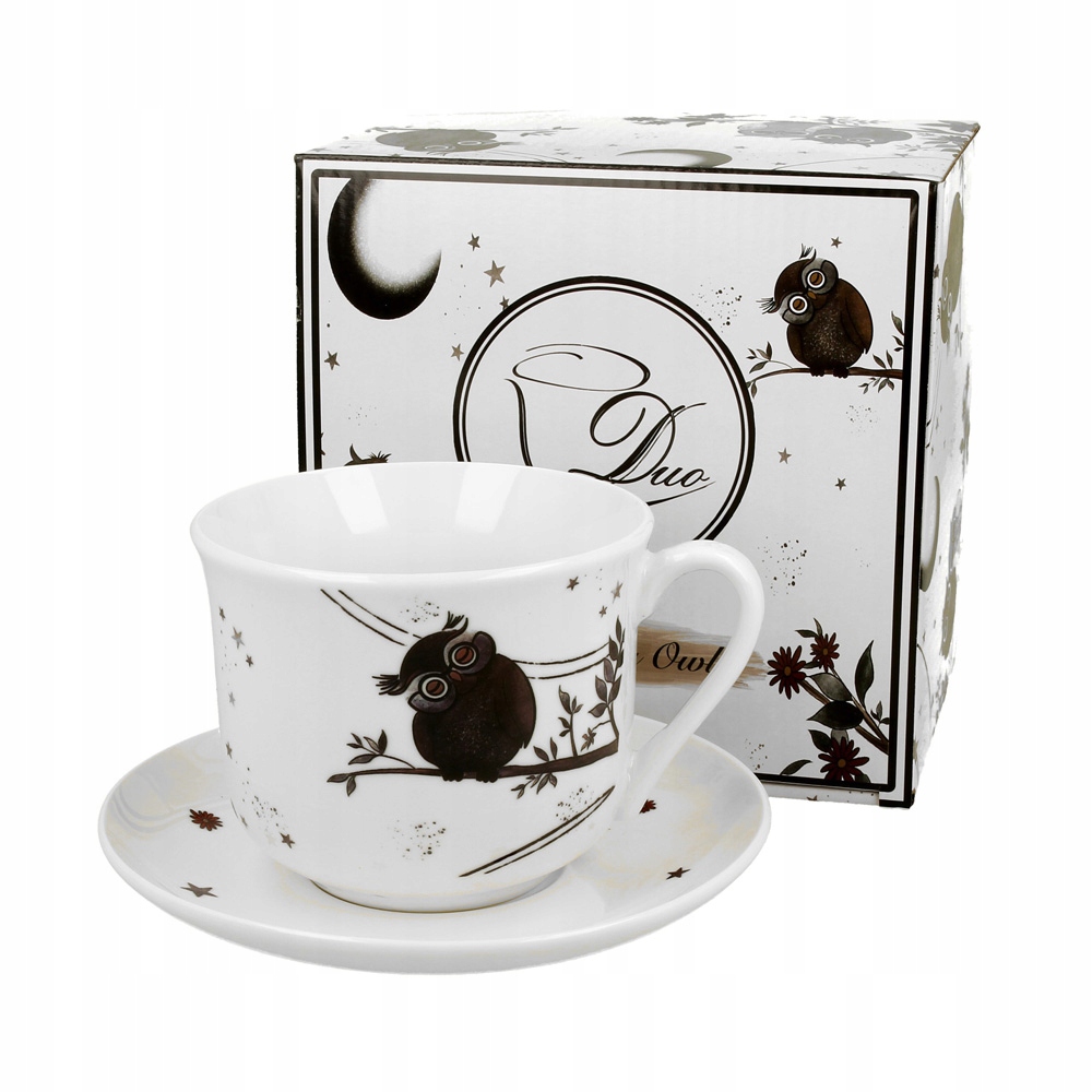Чашка Джамбо 450 мл з блюдцем "Чарівні сови" з білої порцеляни, прикрашена мотивом грайливі сови в темних, виразних кольорах. Колекція в монохромних кольорах і сучасному дизайні вирізняється своїм характером і унікальним стилем.