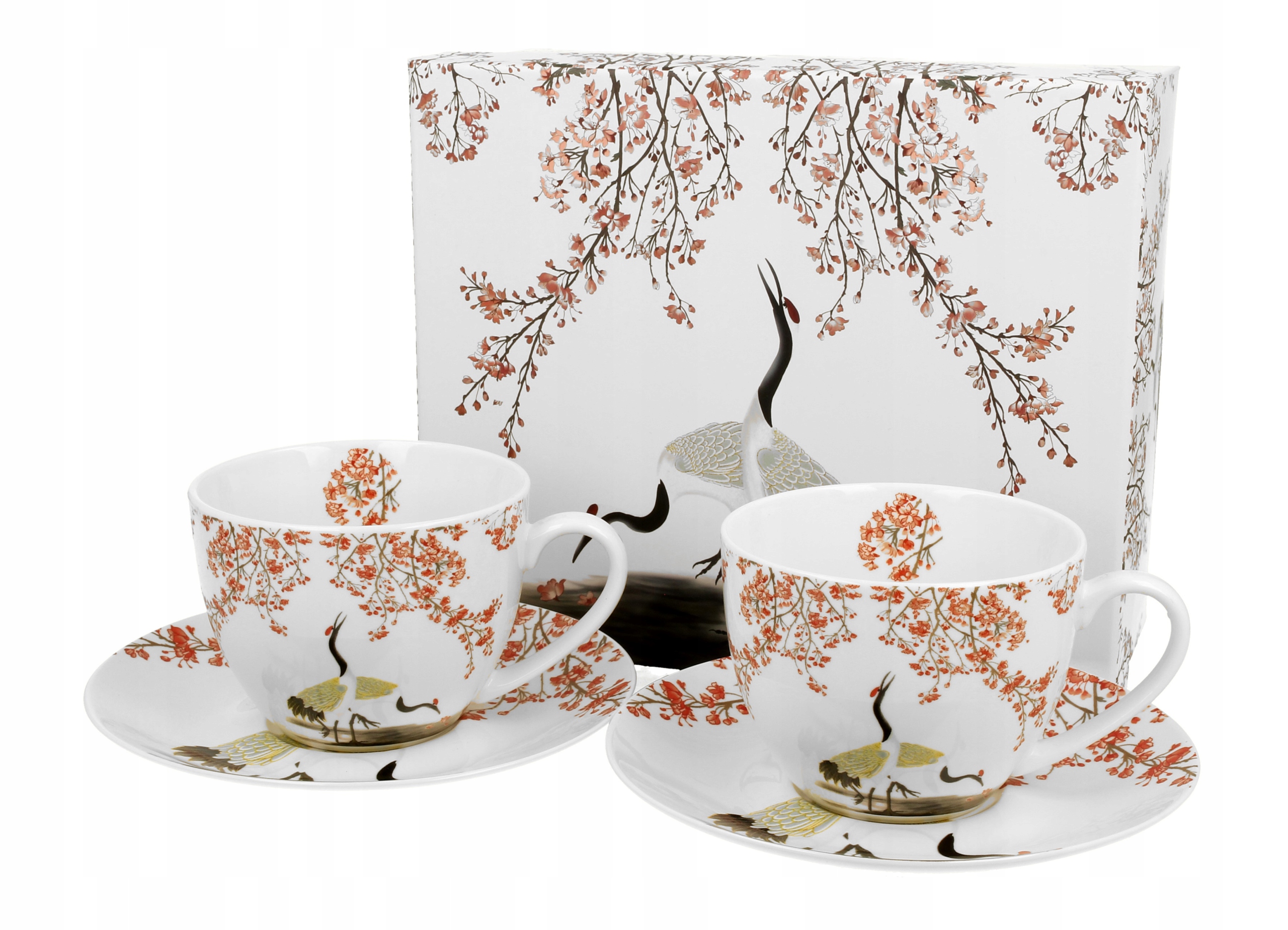 Набір із двох чашок об’ємом 280 мл із блюдцями SAKURA AND CRANES, частина серії Art Gallery, виготовлений із порцеляни New Bone China, що характеризується елегантним і природним виглядом. кремово-білого кольору з ніжним блиском і винятковою міцністю, зберігаючи легкість і ніжність.