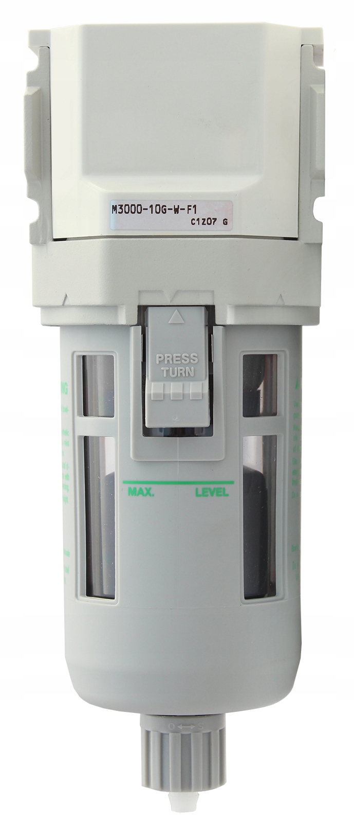 Фільтр туману повітряного масла, CKD M3000 - 10G - F1 - модульний фільтр високого класу, призначений для видалення стисненого повітря твердими та рідкими частинками. Вставка фільтра з градацією 0,01/0,01 [мкм]/[мг/м³]. Фільтр, оснащений автоматичним тригром конденсату з 6 -мм шланговим з'єднанням. Повітряне з'єднання збоку від вхідної та виводу внутрішньої потоку 3/8 ".