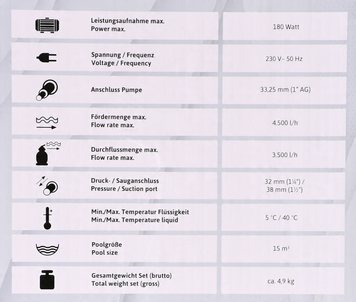 ФІЛЬТР ДЛЯ БАСЕЙНУ З ХЛОРАТОРОМ І НАСОСОМ ДЛЯ БАСЕЙНУ 180 Вт 4500 л/год 15 м3